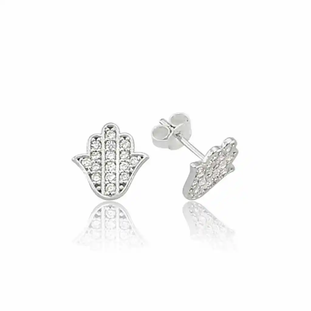 Her ne kadar Hz. Fatma"nın eli olarak bilinse de arapçada “hamse” diye anılır. Hamse, beş anlamına gelir ve bir elin parmak sayısını gösterir. Hz. Fatma bir gün mutfakta helva kavururken, eşi Hz. Ali görür ve pişen helvaya elini daldırır ancak hiçbir şey olmaz, helvayı böyle kavurmayı devam eder. O günden sonra elinin kutsallığına, gücüne adeta yenilmezliğine inanılır. Her güçlük adeta onun eliyle aşılacaktır. Bu eşsiz küpeyi; doğum günü hediyesi, sevgililer günü hediyesi veya annelere hediye olarak özel günlerde tercih edilebilecek mükemmel bir seçenektir. Bu harika tasarım beyaz Fatma eli bayan küpe; 925 ayar gümüşten imal edilmiştir. Gümüş üzerine rodyum kaplama yapılmıştır. Rodyum kaplama yapılan tüm gümüş küpe modelleri parlaklığını uzun süre muhafaza eder, oksitlenmeyi geciktirir. Küpe üzerinde bulunan taşlar zirkondur. Tüm gümüş bayan küpelerde olduğu gibi Fatma ana eli çivili küpe modeli de el emeği ile üretilmiştir. Gümüş ve değerli taşlar nedeniyle belirtilen ortalama ürün ağırlığında ± %10 sapma olabilmektedir.