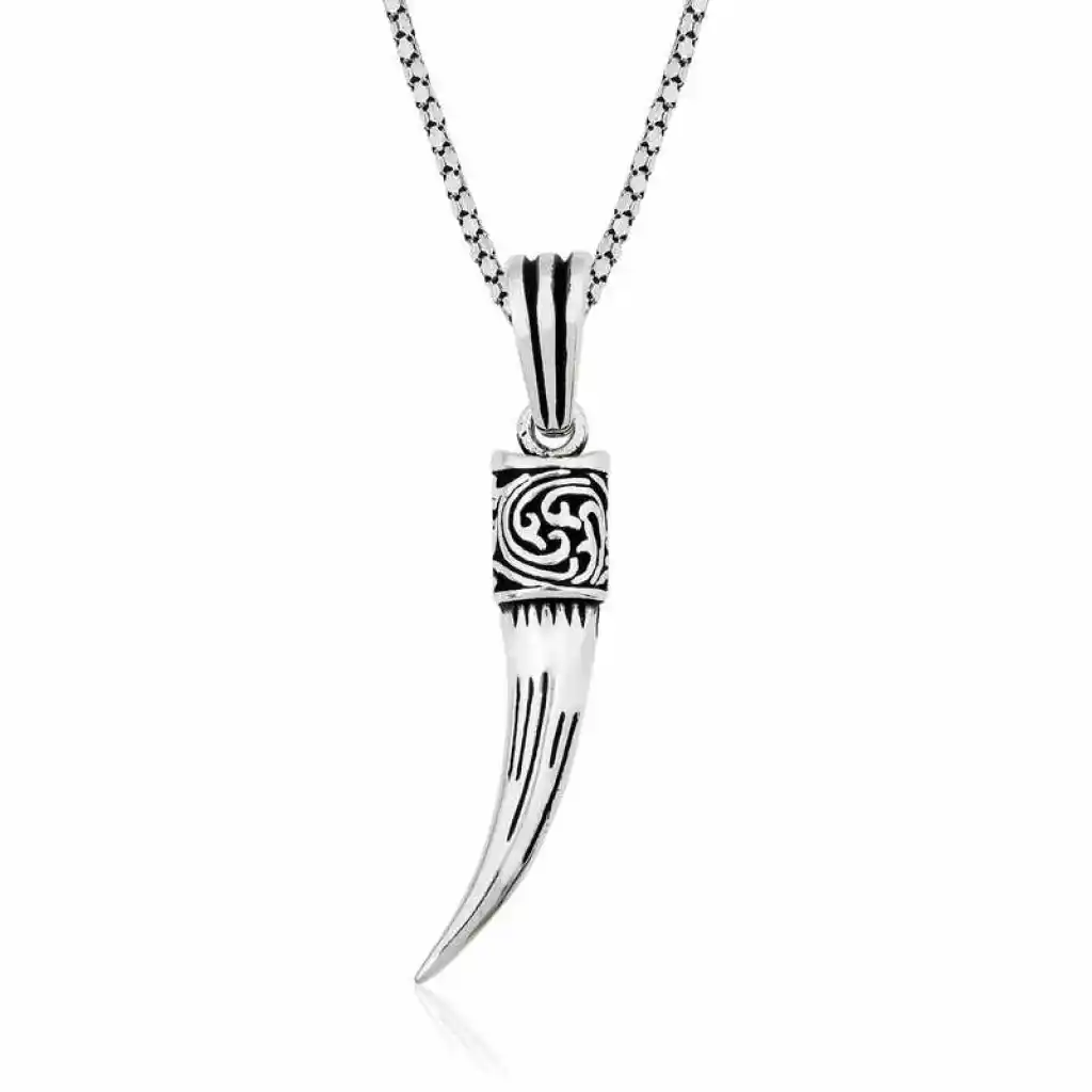 Takı deyince daha çok kadınlar akla gelse de, tarih boyunca hem kadını hem de erkeği etkisi altına almıştır. Kadınların daha zarif ve daha çekici görünmek, erkeklerin ise tarz için taktığı takılar; sosyal statü, kişilik, inanç ve kimliği temsil etmenin yanı sıra daha değişik işlevlere de sahiptir. Birçok kültürde sembolik olarak kullanılan kolye, küpe, halhal, hızma, yüzük, bileklik gibi takılar; tarih boyunca krallar, kraliçeler, firavunlar, köleler, halktan erkekler ve kadınlar tarafından birçok anlama gelecek şekilde yaygın olarak kullanılmaktaydı. Bunlardan biri de fil dişi kolyedir. Bu kolyenin uğur getirdiğine, başarı ve cesaret verdiğine stresi giderdiğine inanılırdı. Tüm kötülüklerden koruduğuna inanılırdı. Gümüş üzerine oksit kaplama yapılmıştır. Oksit kaplama yapılan gümüş kolye modelleri parlaklığını uzun süre muhafaza eder ve kararmayı geciktirir. Gümüş olan zincir boyu ortalama 55 cm"dir. Tüm gümüş kolye modellerinde olduğu gibi gümüş fil dişi kolye modeli de el emeği ile üretilmiştir. Gümüş ve değerli taşlar nedeniyle belirtilen ortalama ürün ağırlığında ± %10 sapma olabilmektedir.