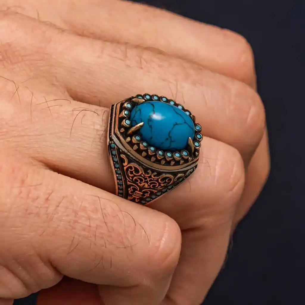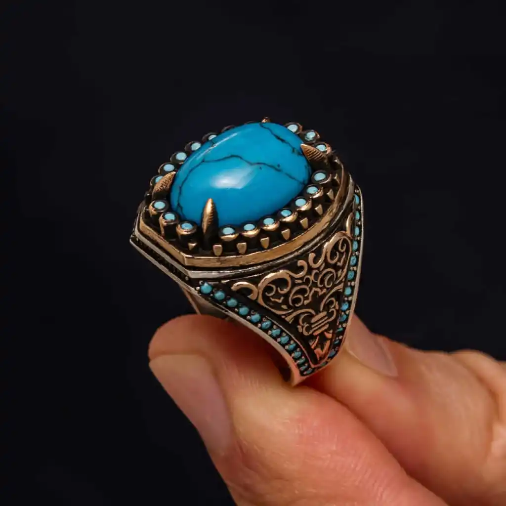 Turkuaz taşı, ‘Firuze’ olarak da bilinir. Firuze taşı yüzük, taşıdığı doğal enerjiler ve şık görünümleriyle dikkat çeker. Firuze taşının, kişinin ruhsal dengesini bulmasına yardımcı olduğu ve duygusal olarak huzur verdiğine inanılır. Aynı zamanda, bu taşın negatif enerjilere karşı bir koruma sağladığı ve kişinin kendini güvende hissetmesine katkı sunduğu düşünülmektedir.Her firuze taşı, doğal yapısı gereği kendine özgü bir renk ve desen taşır, bu da her firuze yüzüğünü benzersiz kılar.Enerjisel anlamda firuze taşı, kişinin kendine olan güvenini artırabileceği ve pozitif düşünceler geliştirmesine yardımcı olabileceği düşünülmektedir.Kendinize yada sevdiklerinize doğum gününde, babalar gününde yada özel günlerde hediye edebilirsiniz. Gümüş üzerine oksit kaplama yapılmıştır. Oksit kaplama yapılan gümüş erkek yüzük modelleri parlaklığını uzun süre muhafaza eder, oksitlenmesi gecikir. Gümüş ve değerli taşlar nedeniyle belirtilen ortalama ürün ağırlığında ± %10 sapma olabilmektedir.