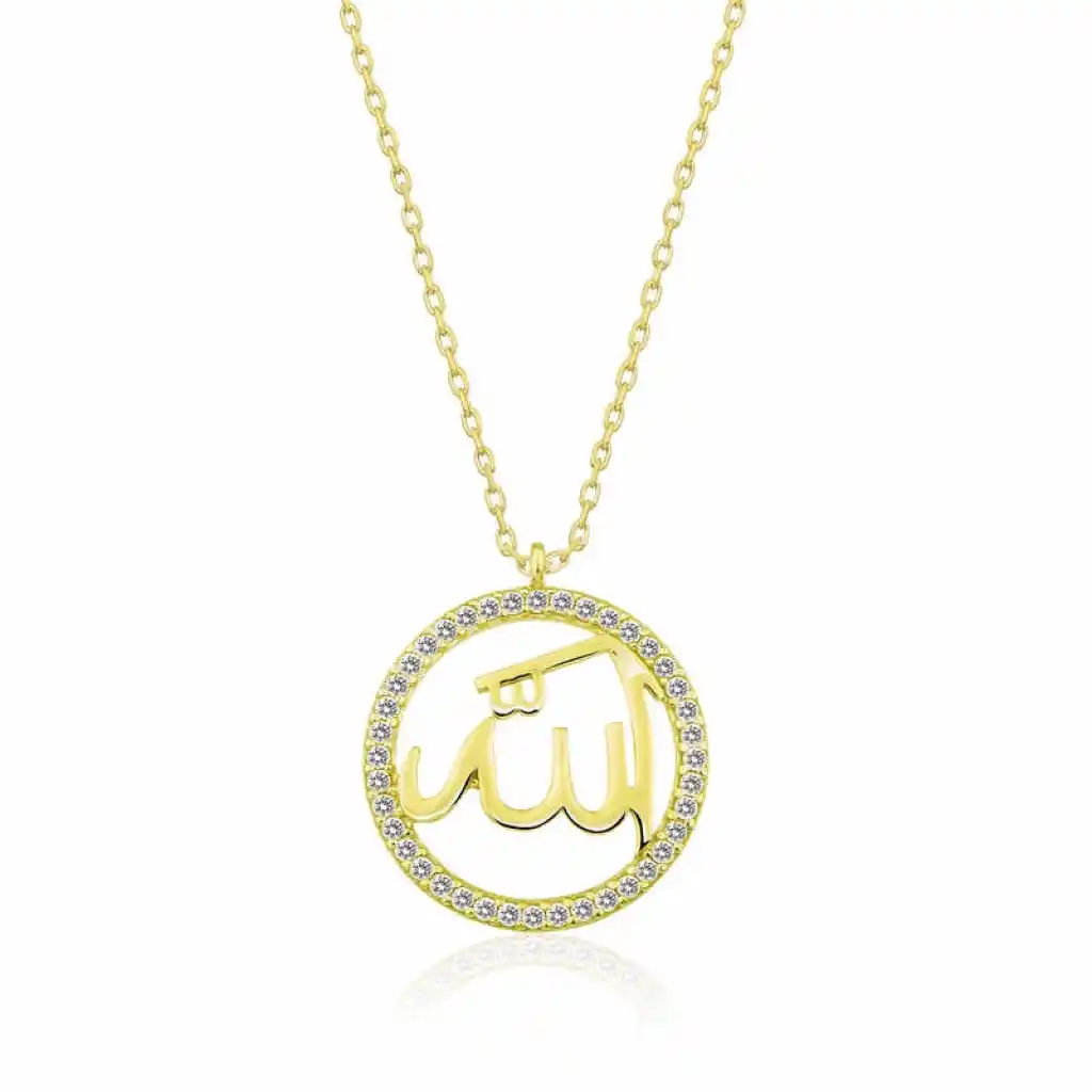 Din, manevi bir tarafı olan inanca dayalı bir sistemdir. Allah, bütün kâinatın ve canlı cansız bütün varlıkların mutlak ve tek yaratıcısıdır. Bu düşüncelere sahip inançlı insanların üzerinde taşımak isteyebilecekleri, günlük hayatta yanlarından ayırmayacakları özel bir aksesuardır. Bu şık kolye modeli manevi duyguları ifade etmenin anlamlı bir yolu olacaktır. Şık bir tasarıma sahip bu kolye size ve sevdiklerinize huzur verecek. Üzerinde arapça Allah yazılı bayan kolye 925 ayar gümüşten imal edilmiştir. Gümüş üzerine gold kaplama yapılmıştır. Gold kaplama yapılan gümüş bayan kolye modelleri parlaklığını uzun süre muhafaza eder ve oksitlenmesi gecikir. Kolye üzerinde bulunan taşlar zirkondur. Gümüş olan zincir boyu ortalama 45 cm"dir. Tüm gümüş bayan kolye modellerinde olduğu gibi gümüş gold arapça Allah yazılı bayan kolye modeli de el emeği ile üretilmiştir. Gümüş ve değerli taşlar nedeniyle belirtilen ürün ağırlığında ± %10 sapma olabilmektedir.