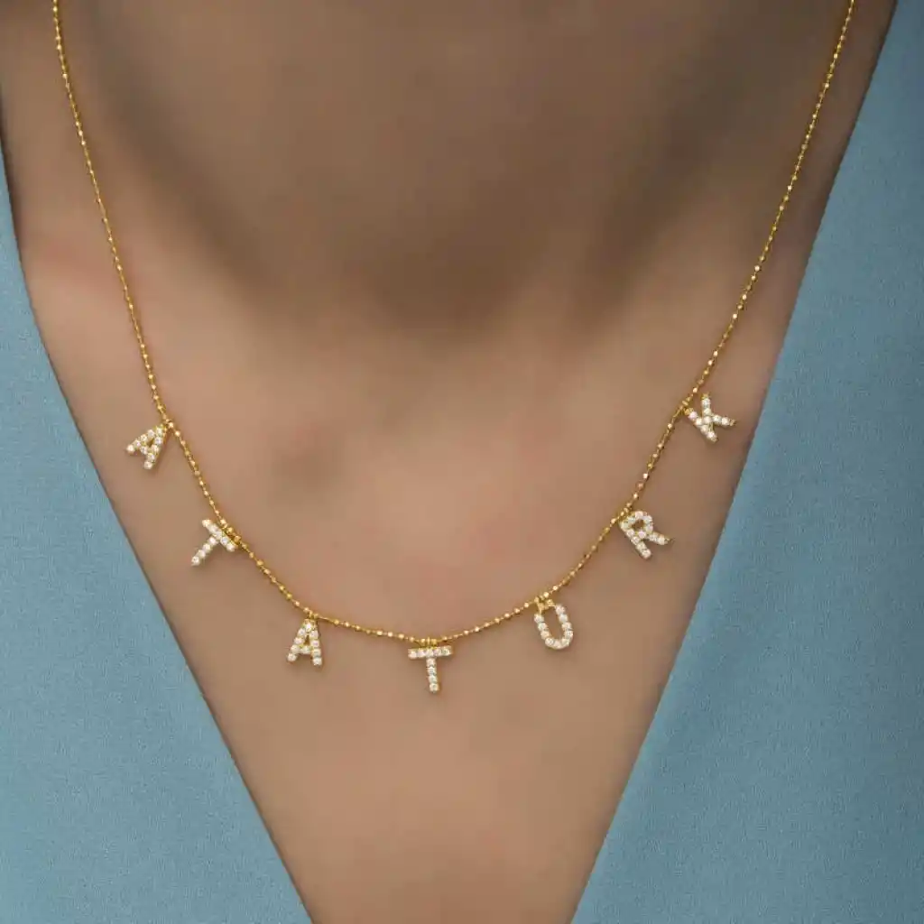 Türkiye Cumhuriyeti"nin kurucusu ve ilk cumhurbaşkanı Mustafa Kemal Atatürk"ün ismi her an yanınızda taşımak ve sevdiklerinizle paylaşmak için kaçırılmayacak bir kolye ile karşı karşıyasınız. Anlam itibariyle sevdiklerinize hediye edebileceğiniz şık hediyelerden biri olacaktır. Bu anlamlı kolye 925 ayar gümüşten imal edilmiştir. Gümüş Atatürk yazılı bayan kolye gold kaplama yapılmıştır. Gold kaplama yapılan gümüş bayan kolye modelleri parlaklığını uzun süre muhafaza eder. Tüm gümüş bayan kolye modellerinde olduğu gibi gümüş Atatürk yazılı bayan kolye modeli de el emeği ile üretilmiştir. Gümüş ve değerli taşlar nedeniyle belirtilen ürün ağırlığında ± %10 sapma olabilmektedir.