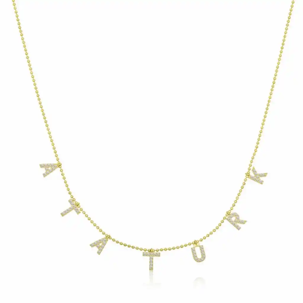 Türkiye Cumhuriyeti"nin kurucusu ve ilk cumhurbaşkanı Mustafa Kemal Atatürk"ün ismi her an yanınızda taşımak ve sevdiklerinizle paylaşmak için kaçırılmayacak bir kolye ile karşı karşıyasınız. Anlam itibariyle sevdiklerinize hediye edebileceğiniz şık hediyelerden biri olacaktır. Bu anlamlı kolye 925 ayar gümüşten imal edilmiştir. Gümüş Atatürk yazılı bayan kolye gold kaplama yapılmıştır. Gold kaplama yapılan gümüş bayan kolye modelleri parlaklığını uzun süre muhafaza eder. Tüm gümüş bayan kolye modellerinde olduğu gibi gümüş Atatürk yazılı bayan kolye modeli de el emeği ile üretilmiştir. Gümüş ve değerli taşlar nedeniyle belirtilen ürün ağırlığında ± %10 sapma olabilmektedir.