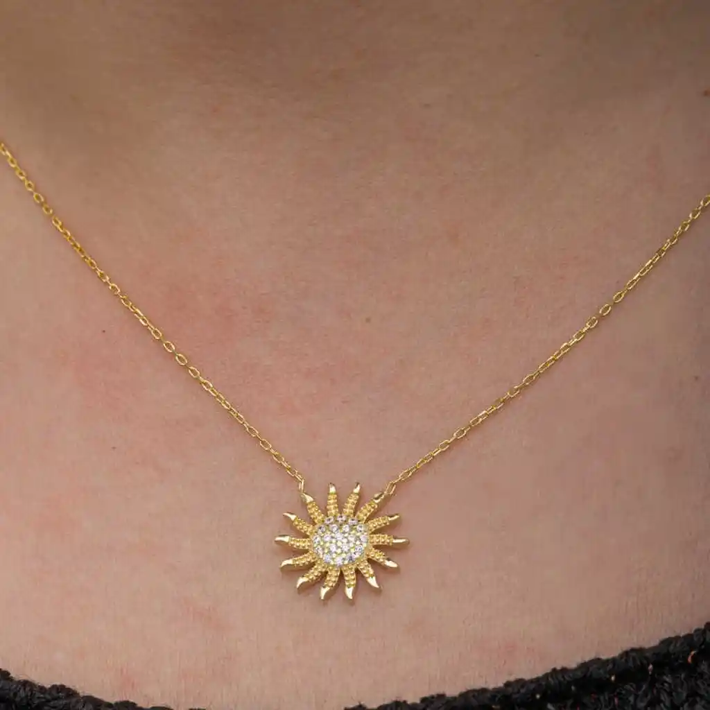 Güneş; ışığın, bilginin, iyiliğin, gücün ve yönetimin sembolüdür. Bu ışıl ışıl ve farklı tasarımıyla göz kamaştıran kolye; 925 ayar gümüşten imal edilmiştir. Gümüş üzerine gold kaplama yapılmıştır. Gold kaplama yapılan gümüş ürünler parlaklığını uzun süre muhafaza eder, oksitlenmesi gecikir. Gümüş beyaz taşlı güneş kadın kolye üzerinde bulunan taşlar zirkon"dur. Tüm gümüş kolyelerde olduğu gibi gümüş güneş kadın kolye de tamamı el emeği ile üretilmiştir. Gümüş ve değerli taşlar nedeniyle belirtilen ortalama ürün ağırlığında ± %10 sapma olabilmektedir.