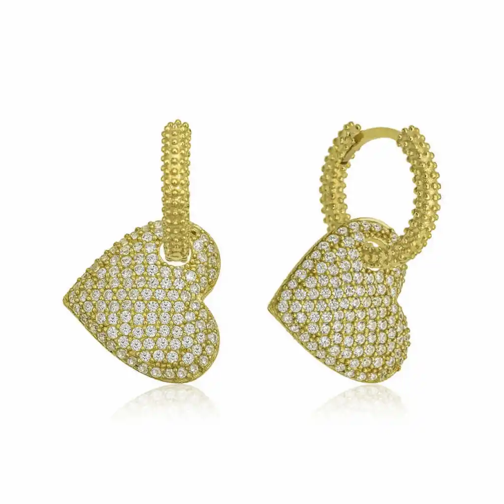 Kalp deseninin hepsi taşlı olan bu harika tasarım kalp küpe modeli 925 ayar gümüşten imal edilmiştir. Kalp tasarımlı küpeler aşkı çağrıştırır. Bu yüzden gümüş küpe güzel bir hediye seçeneği de olabilir. Bu küpe üzerinde zirkon taşlar kullanılmıştır. Gümüşün üzerine oksitlenmesinin gecikmesi ve parlaklığını uzun süre muhafaza etmesi için gold kaplama yapılmıştır. Bu bayan kalp küpe modeli diğer gümüş bayan kalp küpe modellerinde olduğu gibi el emeği ile üretilmiştir. Gümüş ve değerli taşlar nedeniyle belirtilen ortalama ürün ağırlığında ± %10 sapma olabilmektedir.