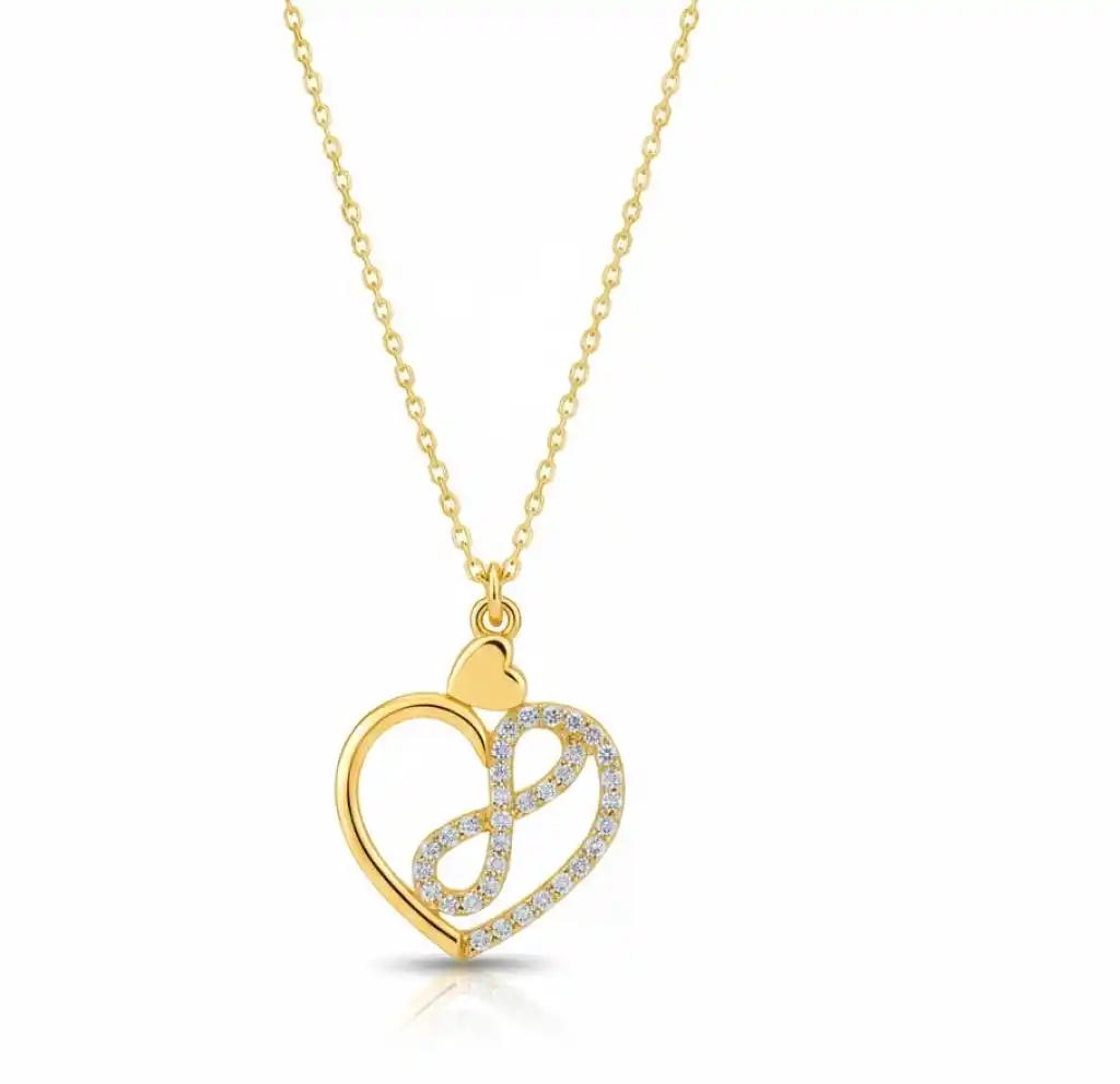 Zarif tasarımı ve anlam yüklü sembolleriyle öne çıkan Gümüş Gold Kalp İçinde Sonsuzluk Kadın Kolye, sevgi ve bağlılığı temsil eden kalp figürü ile sonsuzluk sembolünü bir araya getirerek şık bir bütünlük sunar. Günlük kullanımda sadeliğiyle göz alırken, özel günlerde ise kombinlerinize romantik ve modern bir dokunuş katar.Gold tonlu görünümü sayesinde hem sıcak hem de şık bir duruş sergileyen bu kolye; doğum günü, yıl dönümü, Sevgililer Günü, Anneler Günü gibi özel günlerde hediye olarak da oldukça tercih edilen anlamlı bir aksesuardır. Gümüş ve değerli taşlar nedeniyle belirtilen ortalama ürün ağırlığında ± %10 sapma olabilmektedir.