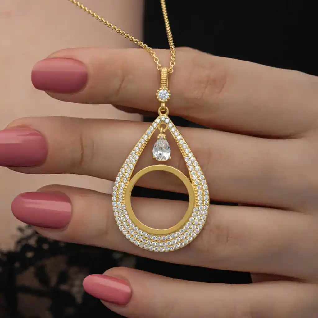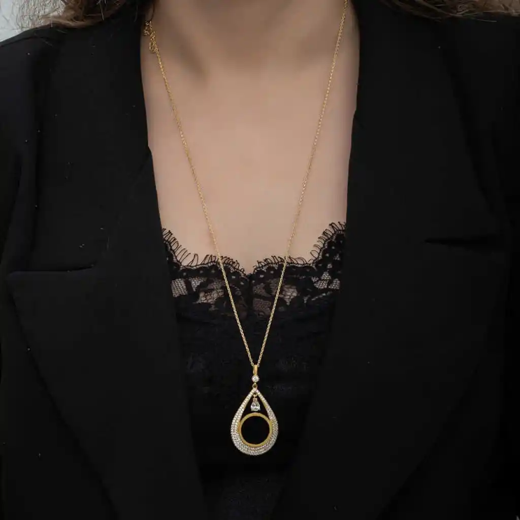 Damla form deseniyle şıklığı ifade eden gümüş çeyrek takılabilen altın kadın kolye modeli ile sevginiz, sevdiğiniz kadının teninde hayat bulsun. Genç sevgililerin ve kendini genç hissedenlerin özel günlerde de seçebileceği bu kadın kolye modeli ile sevdiğinizin bileğini aşkla süsleyin. Sizin olduğu kadar sevdiklerinizin de keyifle takacağı kadın kolye sevdiğinize en güzel hediyelerden biri olacaktır. Bu kadın kolye modeli 925 ayar gümüşten imal edilmiştir. Gümüş üzerine altın kaplama yapılmıştır. Altın kaplama yapılan gümüş kadın kolye modelleri parlaklığını uzun süre muhafaza eder ve oksitlenmesi gecikir. kolye üzerinde bulunan beyaz taşlar zirkondur. Tüm kadın kolye modellerinde olduğu gibi gümüş kadın kolye modeli de el emeği ile üretilmiştir. Gümüş ve değerli taşlar nedeniyle belirtilen ortalama ürün ağırlığında ± %10 sapma olabilmektedir.