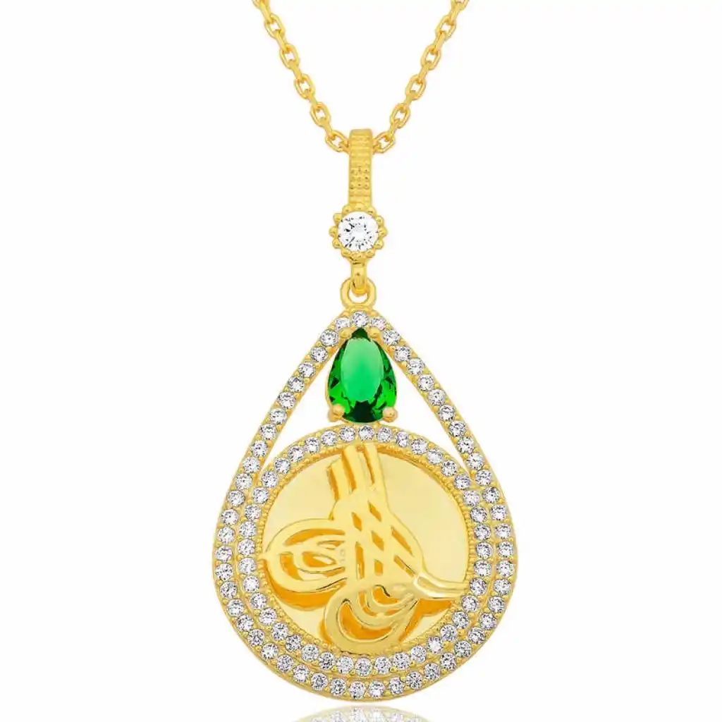 Gümüş Gold Kaplama Yeşil Taşlı Damla Tuğralı Kadın Kolye