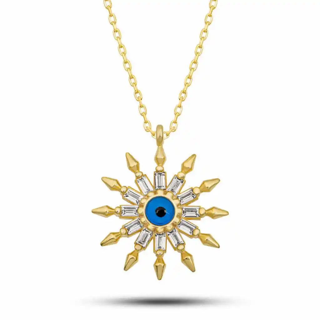 Nazar Boncuğu(koruyucu göz) inancı,kıskanç bir bakışın yol açabileceği kötü enerjilere karşı korunmayı amaçlar.Antik Mezopotamya’dan bu yana birçok kültürde kullanılır.Bu kolye,koruyucu göz ile pozitif enerji yayan güneş sembolünü birleştirerek;hem ruhsal bir savunma mekanizması hem de yaşam kaynağı gücü sunar.Mavi renkli göz simgesi,huzur, pozitif enerji ve ruhsal dinginlik çağrıştırır.Gümüş üzerine gold kaplama yapılmıştır.Gold kaplama yapılan gümüş ürünler parlaklığını uzun süre muhafaza eder,oksitlenmesi gecikir.Tüm gümüş kolyeler de olduğu gibi koruyucu göz güneş kolye de tamamı el emeği ile üretilmiştir.Gümüş ve değerli taşlar nedeniyle belirtilen ortalama ürün ağırlığında ± %10 sapma olabilmektedir.