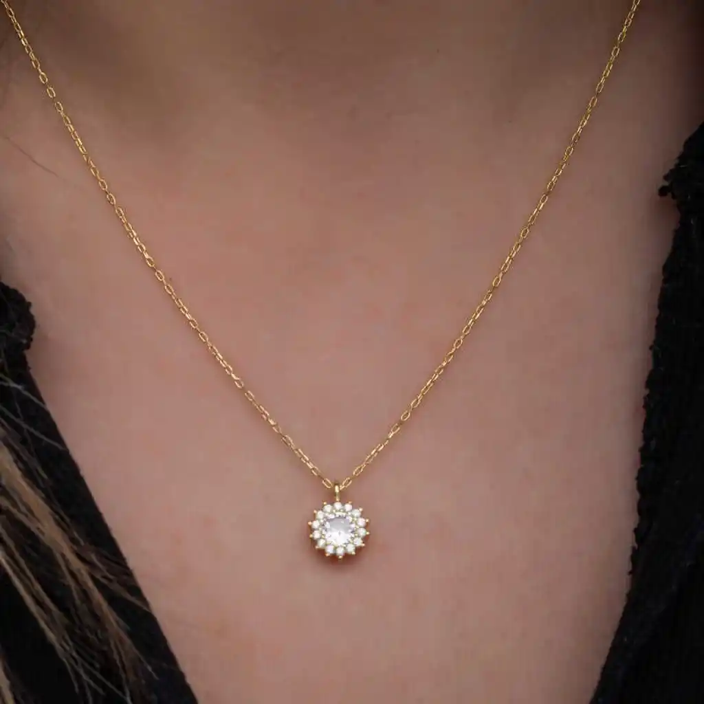 Gümüş üzerindeki zirkon taşlı taştan oluşan bu kadın kolye modeli günün her anında kullanabileceğiniz şık bir aksesuardır. Bu kolyeyi; kendinize ya da sevdiklerinize doğum gününde, Anneler gününde ya da özel günlerde hediye edebilirsiniz. Minimal yuvarlak anturaj kadın kolye modeli 925 ayar gümüşten imal edilmiştir. Gümüş üzerine gold kaplama yapılmıştır. Gold kaplama yapılan gümüş kadın kolye modelleri parlaklığını uzun süre muhafaza eder. Tüm kadın kolyelerde olduğu gibi gümüş yuvarlak anturaj kadın kolye modeli de el emeği ile üretilmiştir. Gümüş ve değerli taşlar nedeniyle belirtilen ortalama ürün ağırlığında ± %10 sapma olabilmektedir.