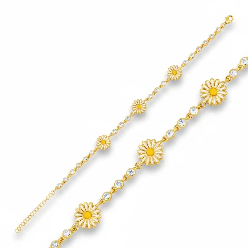 Papatya çiçeği temiz sevgi anlamını ifade eder. En büyük özelliklerinden biri her sapında bir tane olmasıdır. Doğadan esinlenilerek ortaya çıkan bu ışıl ışıl bayan bileklik severek kullanabileceğiniz ve sevdiklerinize hediye edebileceğiniz harika bir tasarımdır. Zarif ve anlam yüklü papatya figürleriyle tasarlanan bu özel bileklik, sadeliği ve şıklığı bir arada sunar. Gold kaplama 925 ayar gümüşten üretilmiş olan bileklik, ince işçiligi ve ışıltılı taş detaylarıyla bilekte göz alıcı bir duruş sergiler. Günlük kullanıma uygun olduğu kadar özel davetlerde de stilinizi tamamlayacak bu tasarım, ayarlanabilir yapısı sayesinde konforlu bir kullanım sağlar. Zamansız ve doğal şıklığı yansıtan papatya bayan bileklik, hem kendiniz için anlamlı bir aksesuar hem de sevdiklerinize duygu dolu bir hediye alternatifi olarak öne çıkar. Gümüş ve değerli taşlar nedeniyle belirtilen ortalama ürün ağırlığında ± %10 sapma olabilmektedir.