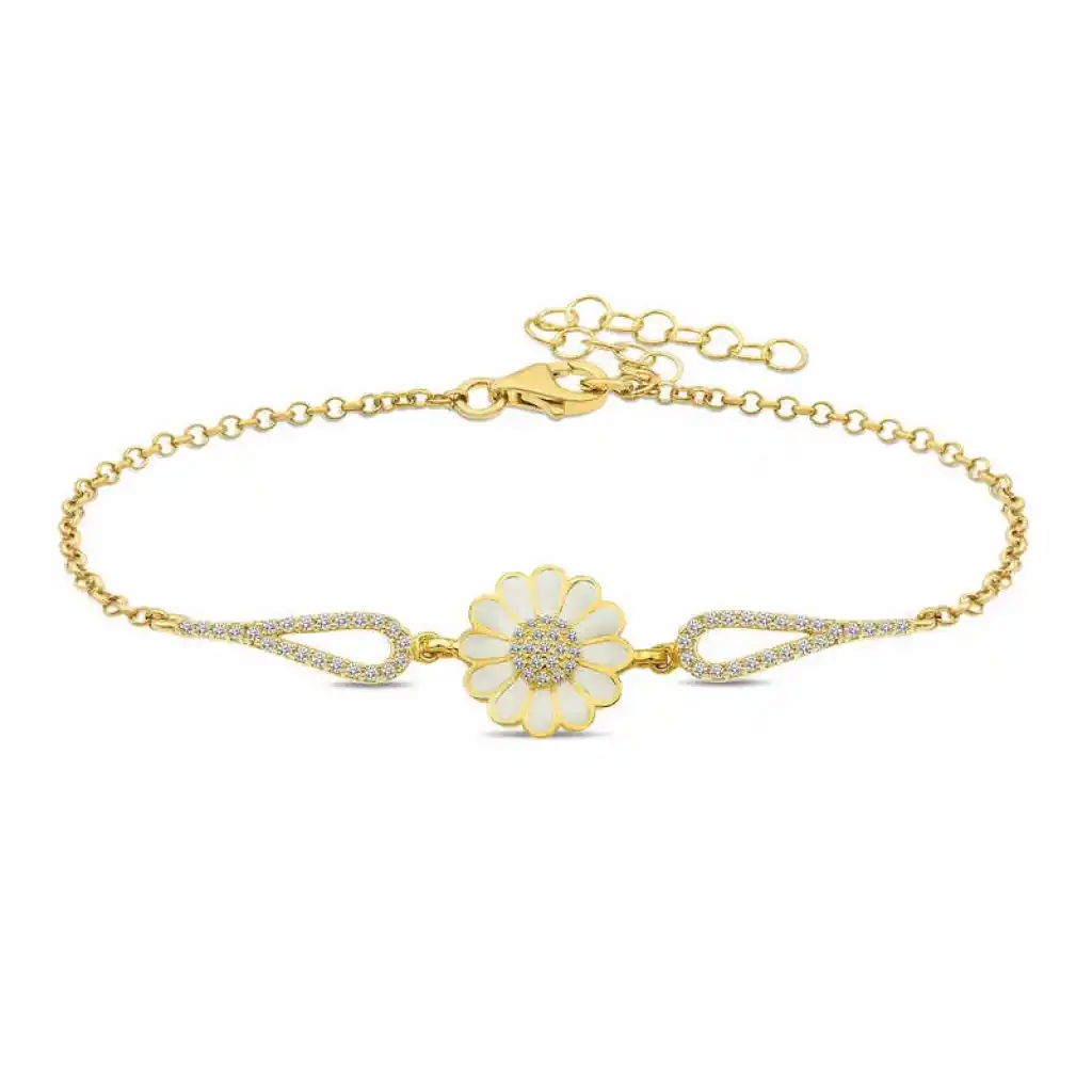 Papatya çiçeği, temiz sevgi anlamını ifade eder. En büyük özelliklerinden biri her sapında bir tane olmasıdır. Bu güzellik tasarlanarak ortaya çıkan bu ışıl ışıl bileklik, zirkon taşlarla süslenmiştir... Bu şık bileklik; doğum günü hediyesi, sevgililer günü hediyesi veya annelere hediye olarak özel günlerde tercih edilebilecek mükemmel bir seçenektir. Gümüş gold papatya bayan bileklik 925 ayar gümüşten imal edilmiştir. Bu bileklik üzerinde rose altın kaplama yapılmıştır. Rose altın kaplama yapılan ürünler parlaklığını uzun süre muhafaza eder. Üzerinde bulunan taşlar zirkon"dur. Tüm gümüş bayan bileklik modellerinde olduğu gibi gümüş gold papatya bayan bileklik modeli de el emeği ile üretilmiştir. Gümüş ve değerli taşlar nedeniyle belirtilen ortalama ürün ağırlığında ± %10 sapma olabilmektedir.