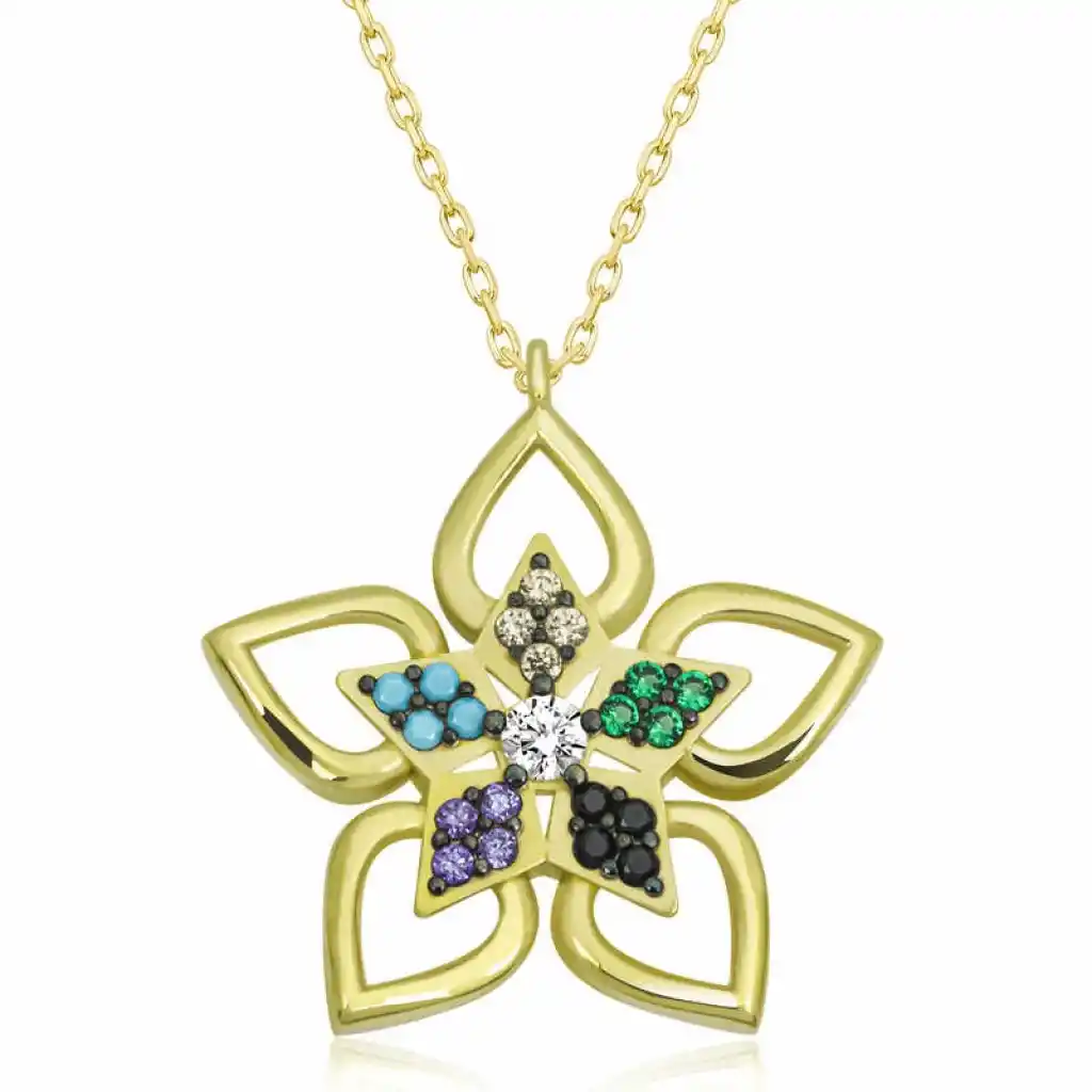 Sevdiklerinize duygularınızı ifade etmenin en özel ve zarif yolu O’na gönderebileceğiniz şık, rengarenk ve mis kokulu çiçeklerdir. Özel günlerde verilecek hediyeler arasında olan çiçek, bu kez farklı bir yorumla tasarlandı... Renkli taşlı çiçek kolye sevgisini bir kez daha anlatmak isteyenleri, sen bir çiçeksin demek isteyenleri bekliyor. Bu özel tasarım, çiçek kadın kolye 925 ayar gümüşten imal edilmiştir. Gümüş üzerine gold kaplama yapılmıştır. Gold kaplama yapılan gümüş kadın kolye modelleri parlaklığını uzun süre muhafaza eder ve oksitlenmesi gecikir. Kolye üzerinde bulunan taşlar zirkondur. Tüm kadın gümüş kolye modellerinde olduğu gibi gümüş çiçek kadın kolye de el emeği ile üretilmiştir. Gümüş ve değerli taşlar nedeniyle belirtilen ürün ağırlığında ± %10 sapma olabilmektedir.