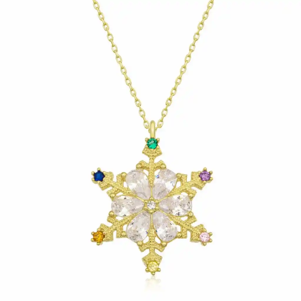 Her kar tanesinden aslında sadece bir tane var. Sevdiğiniz kişiye hediye ettiğiniz kar tanesi kolye ile onun sizin için eşsiz ve biricik olduğunu sessizce dillendirmiş oluyorsunuz. Sizlerde her zevke uygun gümüş kar tanesi kadın kolye modeli ile şıklığınıza ışıltı katın. Kar tanesi kadın kolye 925 ayar gümüşten imal edilmiştir. Gümüş üzerine gold kaplama yapılmıştır. Gold kaplama yapılan gümüş kadın kolye modelleri parlaklığını uzun süre muhafaza eder ve oksitlenmesi gecikir. Kolye üzerinde bulunan beyaz ve renkli taşlar zirkondur. Gümüş olan zincir boyu ortalama 45 cm"dir. Gümüş kar tanesi kadın kolye modeli diğer kar tanesi kadın kolye modelleri gibi el emeği ile üretilmiştir. Gümüş ve değerli taşlar belirtilen nedeniyle ürün ağırlığında ± %10 sapma olabilmektedir.