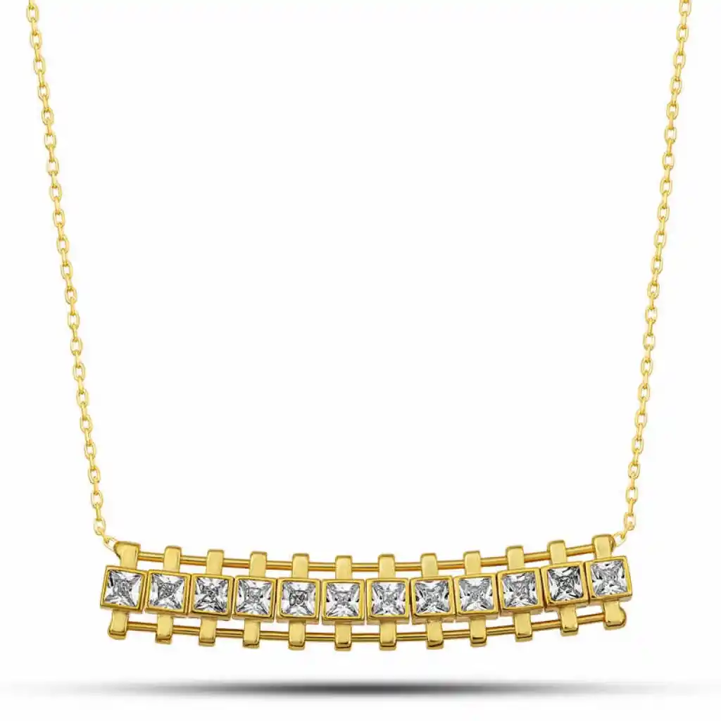 Gümüş Gold Zirkon Taşlı Kare Bar Kadın Kolye