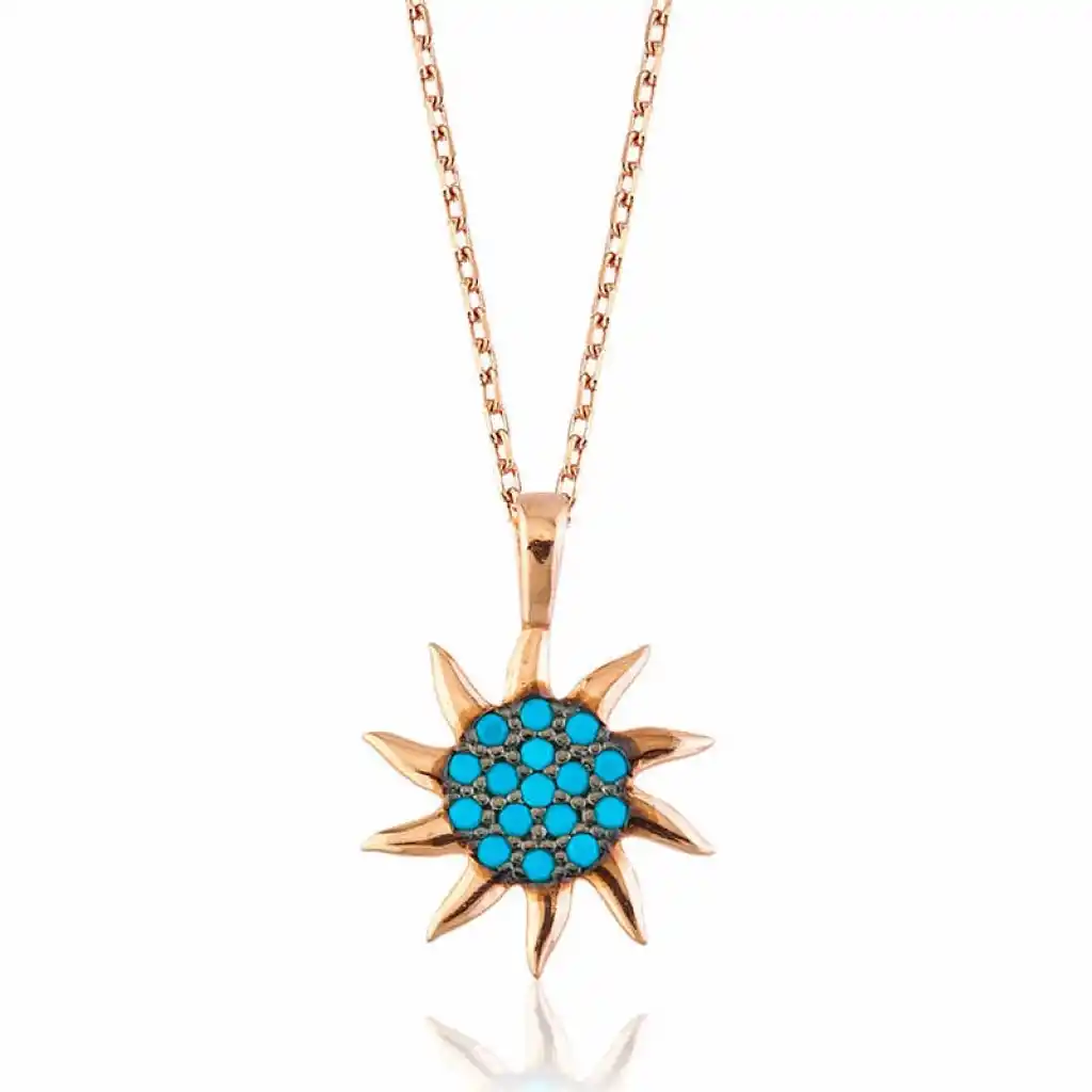 Güneş; ışığın, bilginin, iyiliğin, gücün ve yönetimin sembolüdür. Bu ışıl ışıl ve farklı tasarımıyla bu şık kolye 925 ayar gümüşten imal edilmiştir . Gümüş üzerine rose kaplama yapılmıştır. Rose kaplama yapılan gümüş kolyeler parlaklığını uzun süre muhafaza eder, gümüş rengini pembe renge dönüştürür, oksitlenmesi gecikir. Gümüş güneş bayan kolyenin üzerinde bulunan taşlar firuzedir. Tüm gümüş kolyelerde olduğu gibi gümüş güneş bayan kolyenin de tamamı el emeği ile üretilmiştir . Gümüş ve değerli taşlar nedeniyle belirtilen ortalama ürün ağırlığında ± %10 sapma olabilmektedir.