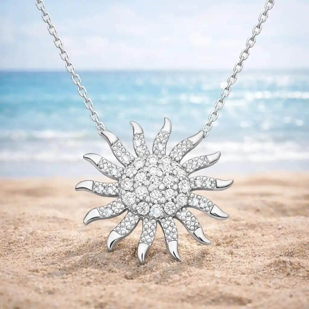 Güneş; ışığın, bilginin, iyiliğin, gücün ve yönetimin sembolüdür. Bu ışıl ışıl ve farklı tasarımıyla göz kamaştıran kolye; 925 ayar gümüşten imal edilmiştir. Gümüş üzerine rodyum kaplama yapılmıştır. Rodyum kaplama yapılan gümüş ürünler parlaklığını uzun süre muhafaza eder, oksitlenmesi gecikir. Gümüş beyaz taşlı güneş bayan kolye üzerinde bulunan taşlar zirkon'dur. Tüm gümüş kolyelerde olduğu gibi gümüş beyaz taşlı güneş bayan kolye de tamamı el emeği ile üretilmiştir. Gümüş ve değerli taşlar nedeniyle belirtilen ortalama ürün ağırlığında ± %10 sapma olabilmektedir.