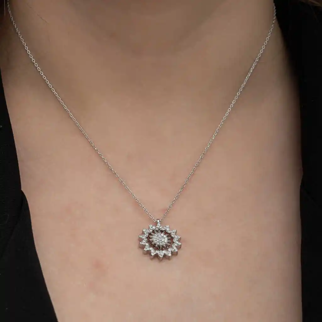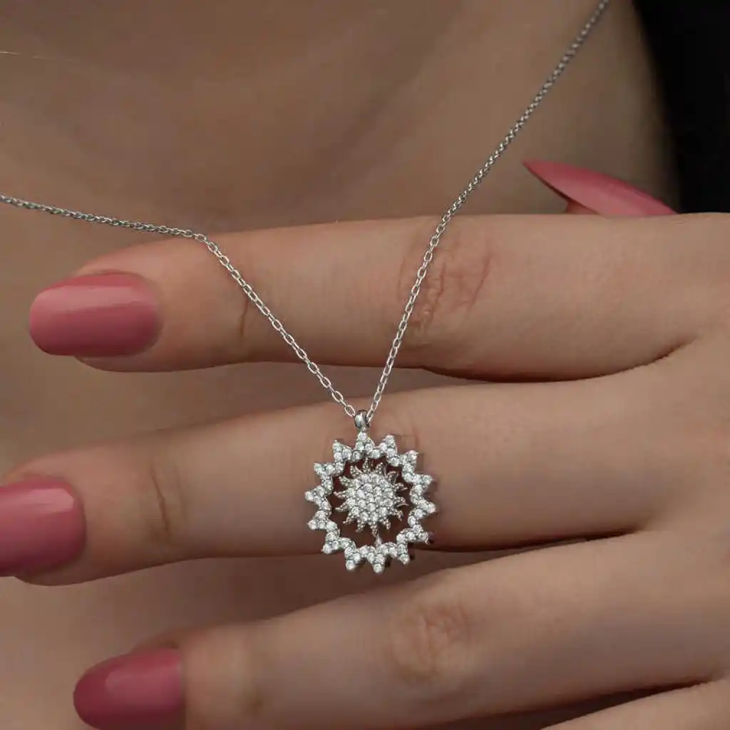 Güneş; ışığın, bilginin, iyiliğin, gücün ve yönetimin sembolüdür. Bu ışıl ışıl ve farklı tasarımıyla göz kamaştıran kolye; 925 ayar gümüşten imal edilmiştir. Gümüş üzerine rodyum kaplama yapılmıştır. Rodyum kaplama yapılan gümüş ürünler parlaklığını uzun süre muhafaza eder, oksitlenmesi gecikir. Gümüş beyaz taşlı güneş kadın kolye üzerinde bulunan taşlar zirkon"dur. Tüm gümüş kolyelerde olduğu gibi gümüş güneş kadın kolye de tamamı el emeği ile üretilmiştir. Gümüş ve değerli taşlar nedeniyle belirtilen ortalama ürün ağırlığında ± %10 sapma olabilmektedir.