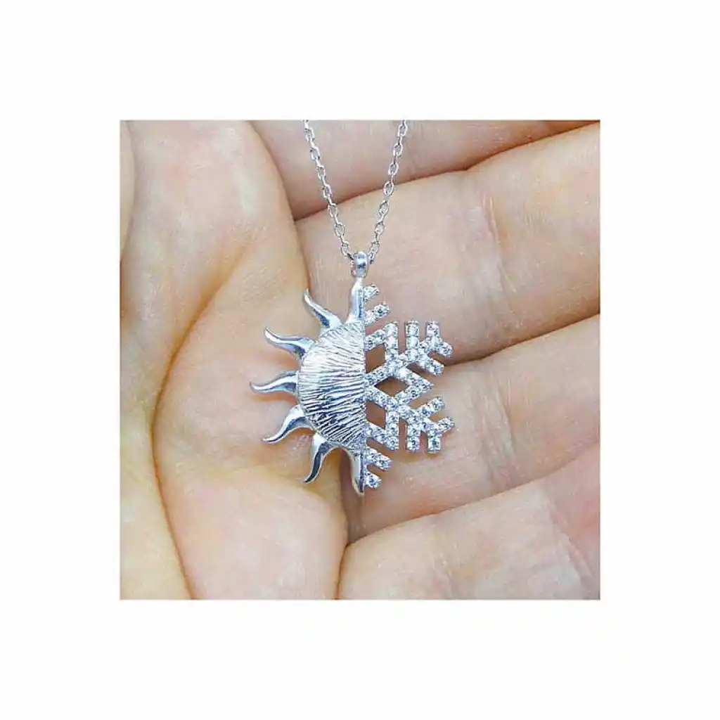 Güneş; ışığın, bilginin, iyiliğin, gücün ve yönetimin sembolüdür. Bu ışıl ışıl ve farklı tasarımıyla göz kamaştıran kolye; 925 ayar gümüşten imal edilmiştir. Gümüş üzerine rodyum kaplama yapılmıştır. Rodyum kaplama yapılan gümüş ürünler parlaklığını uzun süre muhafaza eder, oksitlenmesi gecikir. Gümüş güneş kartanesi bayan kolye üzerinde bulunan taşlar zirkon"dur. Tüm gümüş kolyelerde olduğu gibi gümüş güneş bayan kolye de tamamı el emeği ile üretilmiştir. Gümüş ve değerli taşlar nedeniyle belirtilen ortalama ürün ağırlığında ± %10 sapma olabilmektedir.