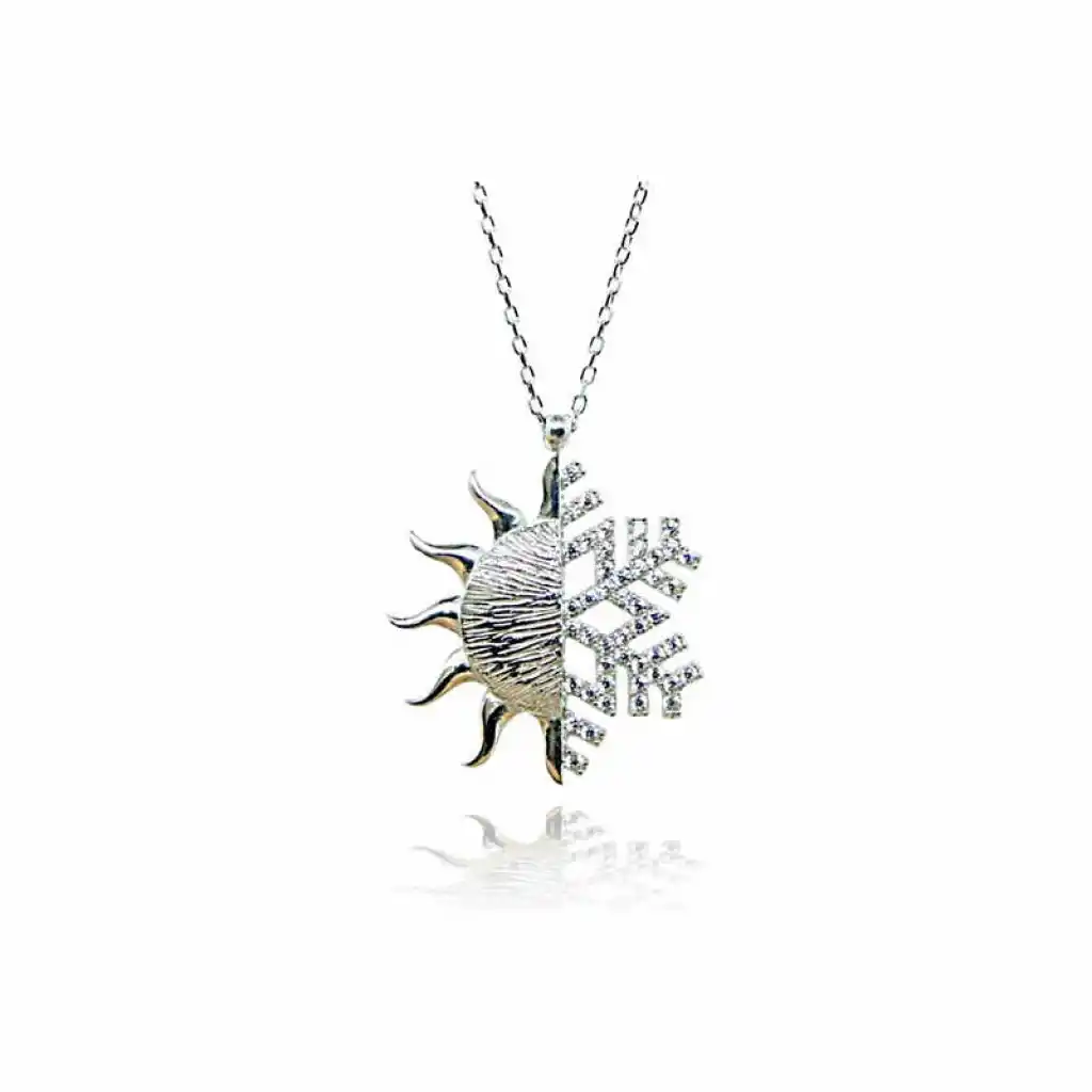 Güneş; ışığın, bilginin, iyiliğin, gücün ve yönetimin sembolüdür. Bu ışıl ışıl ve farklı tasarımıyla göz kamaştıran kolye; 925 ayar gümüşten imal edilmiştir. Gümüş üzerine rodyum kaplama yapılmıştır. Rodyum kaplama yapılan gümüş ürünler parlaklığını uzun süre muhafaza eder, oksitlenmesi gecikir. Gümüş güneş kartanesi bayan kolye üzerinde bulunan taşlar zirkon"dur. Tüm gümüş kolyelerde olduğu gibi gümüş güneş bayan kolye de tamamı el emeği ile üretilmiştir. Gümüş ve değerli taşlar nedeniyle belirtilen ortalama ürün ağırlığında ± %10 sapma olabilmektedir.