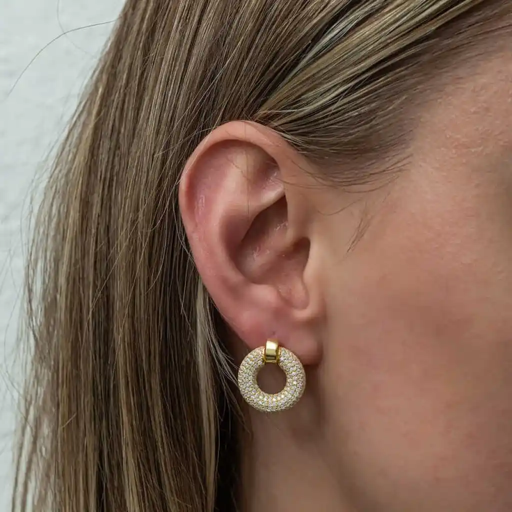 Halka detayı ile göz kamaştıran küpe; zarifliğinizi ve şıklığınızı daimi kılmanıza yardımcı oluyor. Yenilikçi dokunuşlarla tasarlanmış bu küpe, özel gün ve gecelerde kombinlerinize eşlik edecek hoş bir üründür. Siz de bu şık küpeyi, takı koleksiyonunuza dahil edebilirsiniz. Halka bayan küpe; 925 ayar gümüşten imal edilmiştir.Gümüş üzerine gold kaplama yapılmıştır. Üzerinde bulunan taşlar zirkondur. Diğer küpelerde olduğu gibi gümüş halka bayan küpe de el emeği ile üretilmiştir. Gümüş ve değerli taşlar nedeniyle belirtilen ortalama ürün ağırlığında ± %10 sapma olabilmektedir.