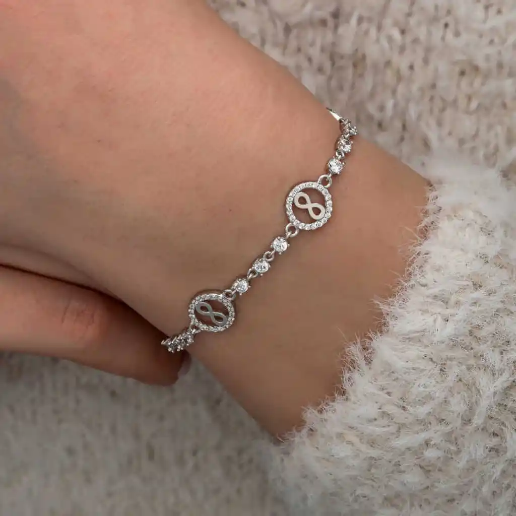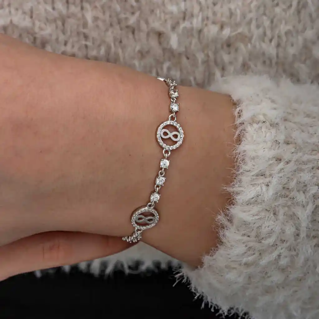 Sonsuzluk sembolü, aşkın ve bağlılığın sınırsızlığını temsil eder.Kişiler arasında güçlü bir bağı ve destekleyici bir ilişkiyi simgeler.Sonsuza kadar sürecek aşkı anlatmanın en güzel yollarından biri de sevdiklerinize sonsuzluk sembollü gümüş takılar hediye etmektir.Sonsuzluk sembolü ebedi aşkın ve sadakatin işareti olarak evlilik yıl dönümü veya sevgililer günü gibi özel günlerde alınabilecek anlamlı hediyelerinden biridir. Rodyum kaplama yapılan kalp bileklik parlaklığını uzun süre muhafaza eder ve oksitlenmesi gecikir. Tüm kadın bilekliklerde olduğu gibi gümüş pembe kalpli kadın bileklik de el emeği ile üretilmiştir. Gümüş ve değerli taşlar nedeniyle belirtilen ortalama ürün ağırlığında ± %10 sapma olabilmektedir.
