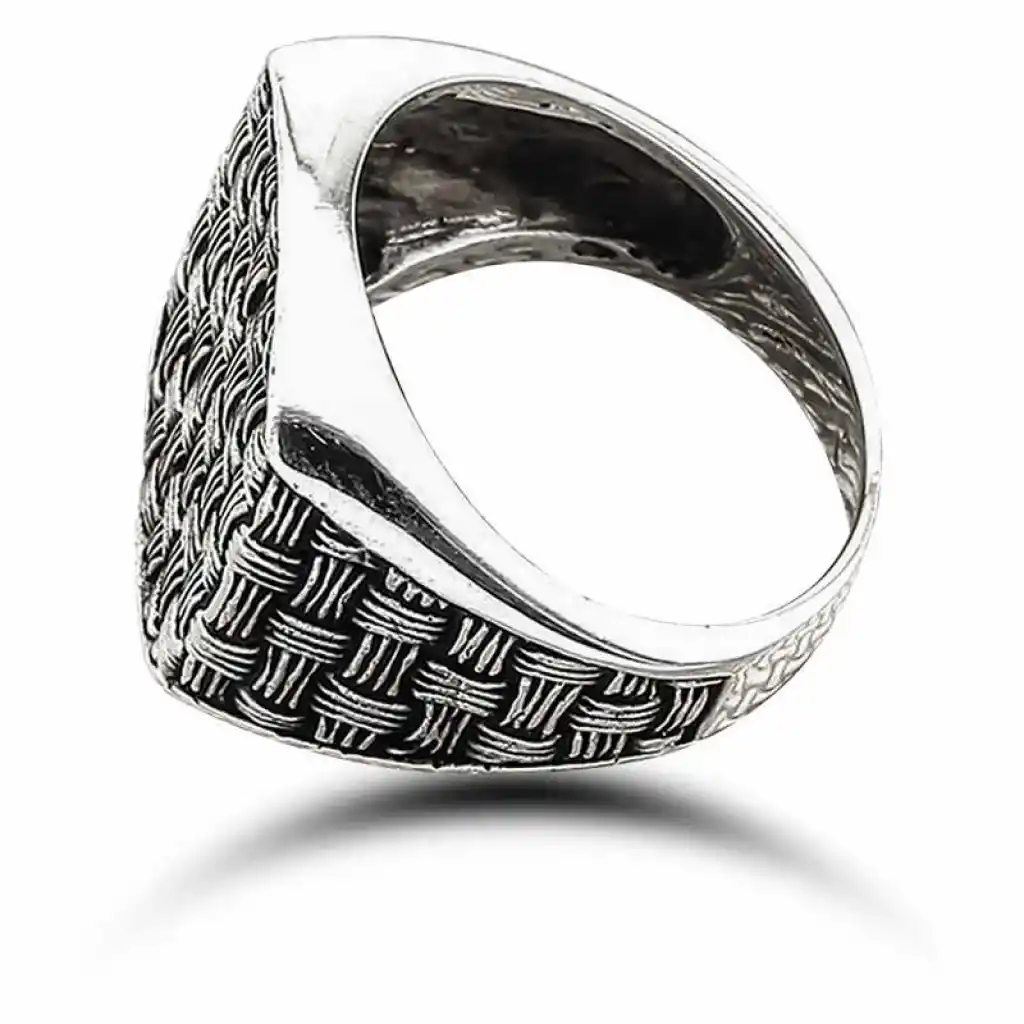 Bu şık tasarım sizler için oluşturuldu... Bu mükemmel yüzük; kendinize yada sevdiklerinize doğum gününde, babalar gününde yada özel günlerde hediye edebilirsiniz. Herkesin severek kullanacağı bu erkek yüzük 925 ayar gümüşten imal edilmiştir. Gümüş üzerine oksit kaplama yapılmıştır. Tüm gümüş erkek yüzüklerinde olduğu gibi gümüş hasır desenli erkek yüzük de tamamı el emeği ile üretilmiştir. Gümüş ve değerli taşlar nedeniyle belirtilen ortalama ürün ağırlığında ± %10 sapma olabilmektedir.