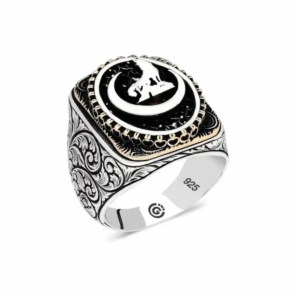 Gümüş üzerindeki hilal bozkurt oval erkek yüzük modeli günün her anında kullanabileceğiniz şık bir aksesuardır. Bu yüzüğü; kendinize ya da sevdiklerinize doğum gününde, babalar gününde ya da özel günlerde hediye edebilirsiniz. Hilal bozkurt erkek yüzük modeli 925 ayar gümüşten imal edilmiştir. Gümüş üzerine oksit kaplama yapılmıştır. Oksit kaplama yapılan gümüş erkek yüzük modelleri parlaklığını uzun süre muhafaza eder. Tüm erkek yüzüklerde olduğu gibi gümüş hilal bozkurt erkek yüzük modeli de el emeği ile üretilmiştir. Gümüş ve değerli taşlar nedeniyle belirtilen ortalama ürün ağırlığında ± %10 sapma olabilmektedir.