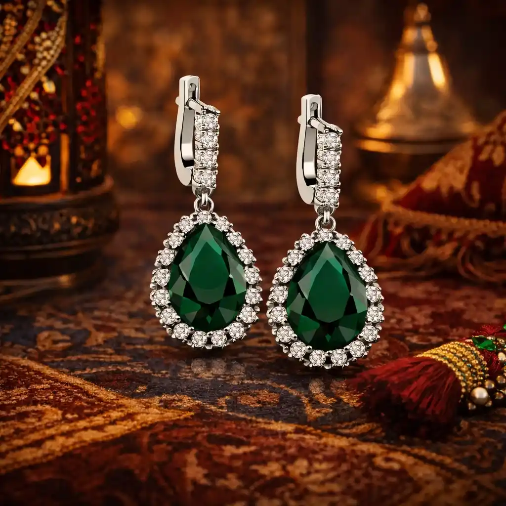 Şıklığı, zarafeti ve bütün ihtişamıyla Hürrem Sultan ve onu yansıtan birbirinden eşsiz takıları... Osmanlı motiflerini taşıyan, doğal taşlı, iri gümüş küpeler tüm kadınların vazgeçilmezi... Hiçbir dönemde zarafetinden ödün vermeyen Hürrem Sultan modellerini doğum günü hediyesi veya annelere hediye olarak özel günlerde tercih edilebilecek mükemmel bir seçenektir. Hürrem Sultan bayan küpe 925 ayar gümüş kullanılarak imal edilmiştir. Yeşil, beyaz zirkon taşlar kullanılarak ortaya çıkan Gümüş Hürrem Sultan bayan küpe modeli üzerine oksit kaplama yapılmıştır. Tüm gümüş otantik yüzüklerinde olduğu gibi gümüş Hürrem Sultan bayan küpe de el emeği ile üretilmiştir. Gümüş ve değerli taşlar nedeniyle belirtilen ortalam ürün ağırlığında ± %10 sapma olabilmektedir.
