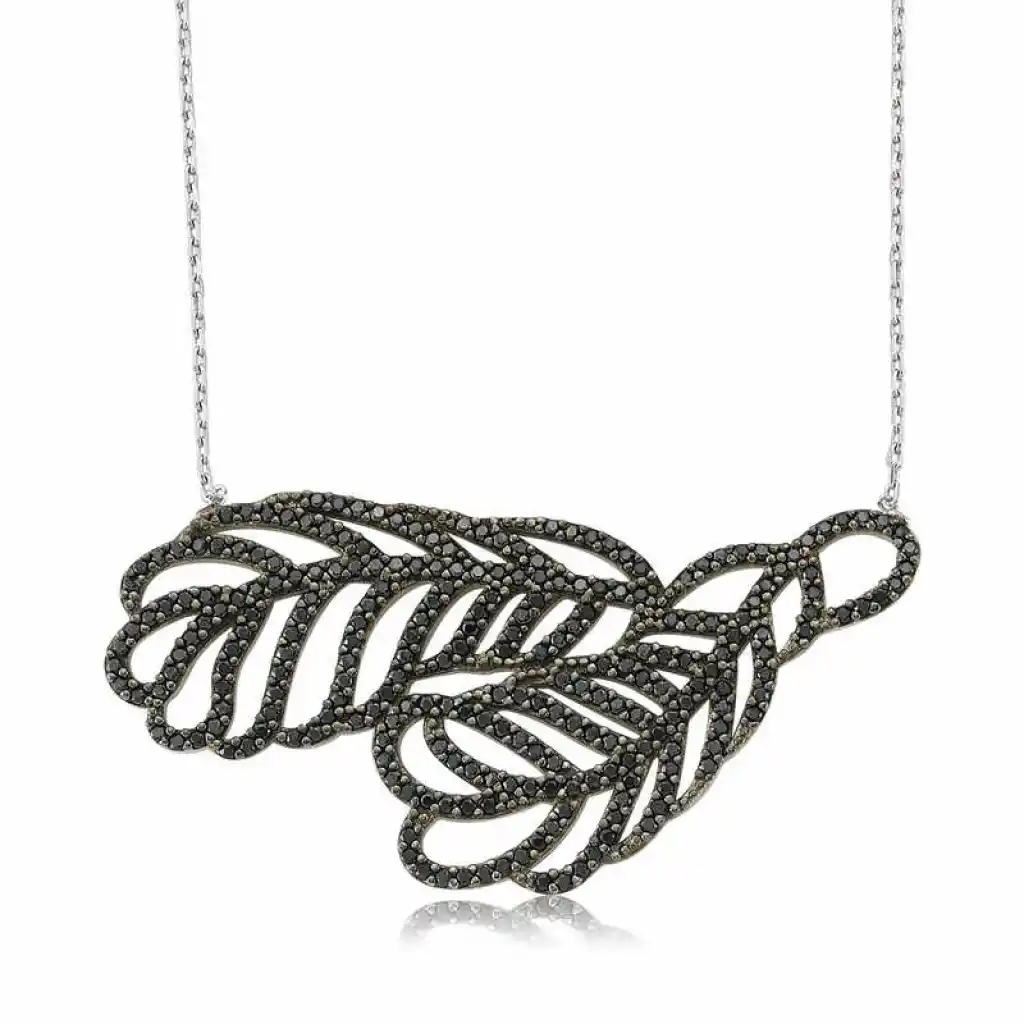 Gümüş ve siyah zirkon taşların ışıltısı ile şık ve zarif olmaya ne dersiniz. Sizin olduğu kadar sevdiklerinizin de keyifle takacağı iki yaprak bayan kolye, sizi ve sevdiğinizi sembolize eden en güzel hediyelerden biri olacaktır. İki yaprak bayan kolye modeli 925 ayar gümüşten imal edilmiştir. Gümüş üzerine rodyum kaplama yapılmıştır. Rodyum kaplama yapılan gümüş bayan kolye modelleri parlaklığını uzun süre muhafaza eder ve oksitlenmesi gecikir. Kolye üzerinde bulunan taşlar zirkondur. Gümüş olan zincirin boyu ortalama 45 cm"dir. Tüm gümüş bayan kolye modellerinde olduğu gibi gümüş iki yaprak bayan kolye modeli de el emeği ile üretilmiştir. Gümüş ve değerli taşlar nedeniyle belirtilen ürün ağırlığında ± %10 sapma olabilmektedir.