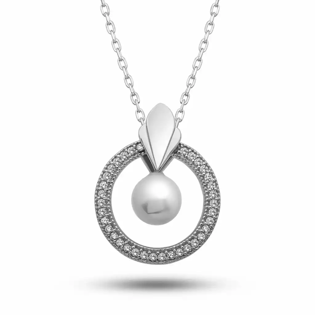 Zarafetin simgesi inci ile modern çember formunu buluşturan bu özel tasarım kolye, günlük şıklıktan özel anlara kadar her stile uyum sağlayan sofistike bir aksesuardır. Parlak 925 ayar gümüşten üretilen kolye, merkezde yer alan inci detayıyla doğal bir ışıltı sunarken, çemberi çevreleyen taşlı işlemeler feminen bir parıltı katar. Üst kısmındaki zarif yaprak formu ise tasarıma estetik bir akış ve özgün bir karakter kazandırır. Hem şık hem de minimal detaylarıyla öne çıkan bu kolye, sevdiklerinize hediye etmek veya kendi stilinizi tamamlamak için ideal bir seçenektir.Gümüş ve değerli taşlar nedeniyle belirtilen ürün ağırlığında ± %10 sapma olabilmektedir.