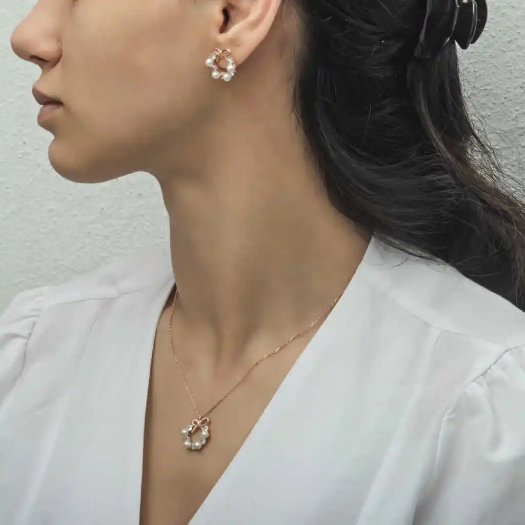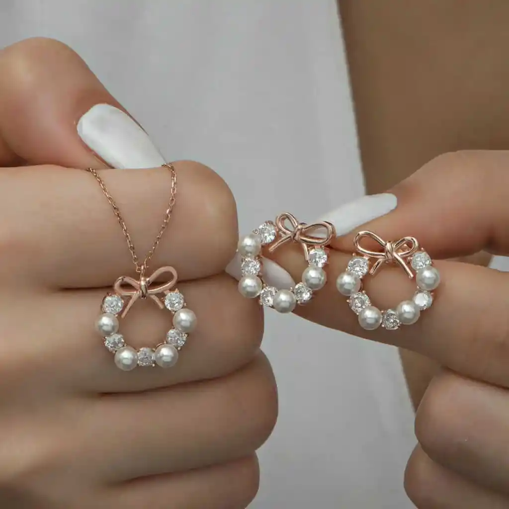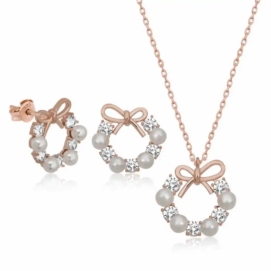 Zarif bir görünüm yakalamak isteyen tüm kadınlara hitap eden, modası hiç geçmeyecek gümüş inci taşlı set sizleri bekliyor. Rose kaplama gümüş, inci ve zirkon taşının göz alıcı ışıltısı ile etrafınıza parıltı saçmaya ne dersiniz... Sizin olduğu kadar sevdiklerinizin de keyifle takacağı inci set, aynı zamanda sevginizi paylaşabileceğiniz en güzel hediyelerden biri olacaktır... 925 ayar gümüşten imal edilmiştir. Gümüş üzerine rose kaplama yapılmıştır. Rose kaplama yapılan ürünler parlaklığını uzun süre muhafaza eder, oksitlenmesi gecikir. Üzerinde bulunan beyaz taşlar zirkon, inci ise kültür incisidir. Ürünlerimizin tamamı el emeği ile üretilmiştir. Gümüş ve değerli taşlar nedeniyle ürün ağırlığında ± %10 sapma olabilmektedir.