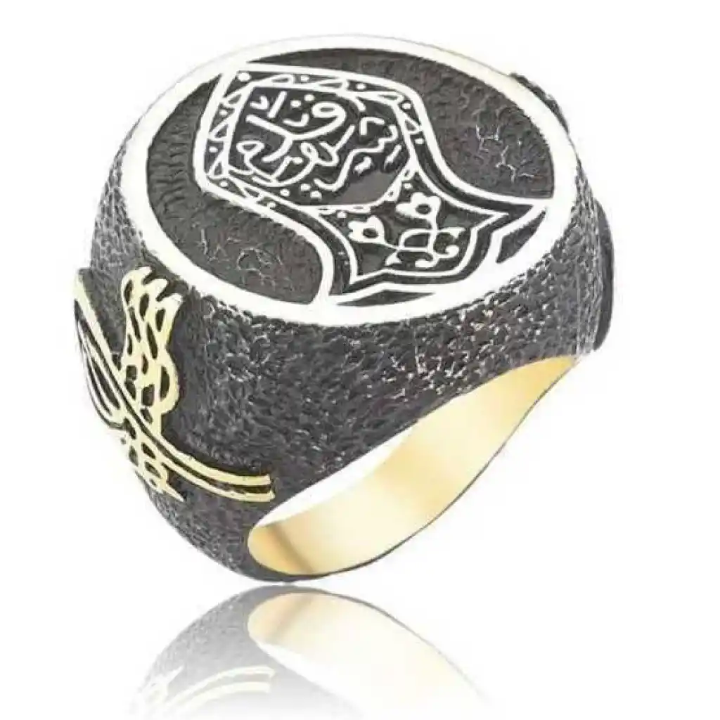 Kadem-i Şerif Peygamber Efendimizin ayağına giydiği nalın şeklinde ki sandelettir. Kademi Şerif düz topuksuz parmak arası bir terlik yada sandalet tarzında bir ayakkabıdır. İslamiyette Kadem-i Şerif’in önemi çok büyüktür.Ve çok büyük şifaları vardır... Bu maneviyattan esinlenerek oluşturulan Kadem-i Şerif erkek yüzük; kendinize yada sevdiklerinize doğum gününde, babalar gününde yada özel günlerde hediye edebilirsiniz. Bu şık erkek yüzük 925 ayar gümüşten imal edilmiştir. Gümüş üzerine oksit kaplama yapılmıştır. Oksit kaplama yapılan yüzükler parlaklığını uzun süre muhafaza eder. Tüm erkek yüzüklerde olduğu gibi gümüş Kadem-i Şerif erkek yüzük de el emeği ile üretilmiştir. Gümüş ve değerli taşlar nedeniyle ürün ağırlığında ± %10 sapma olabilmektedir.