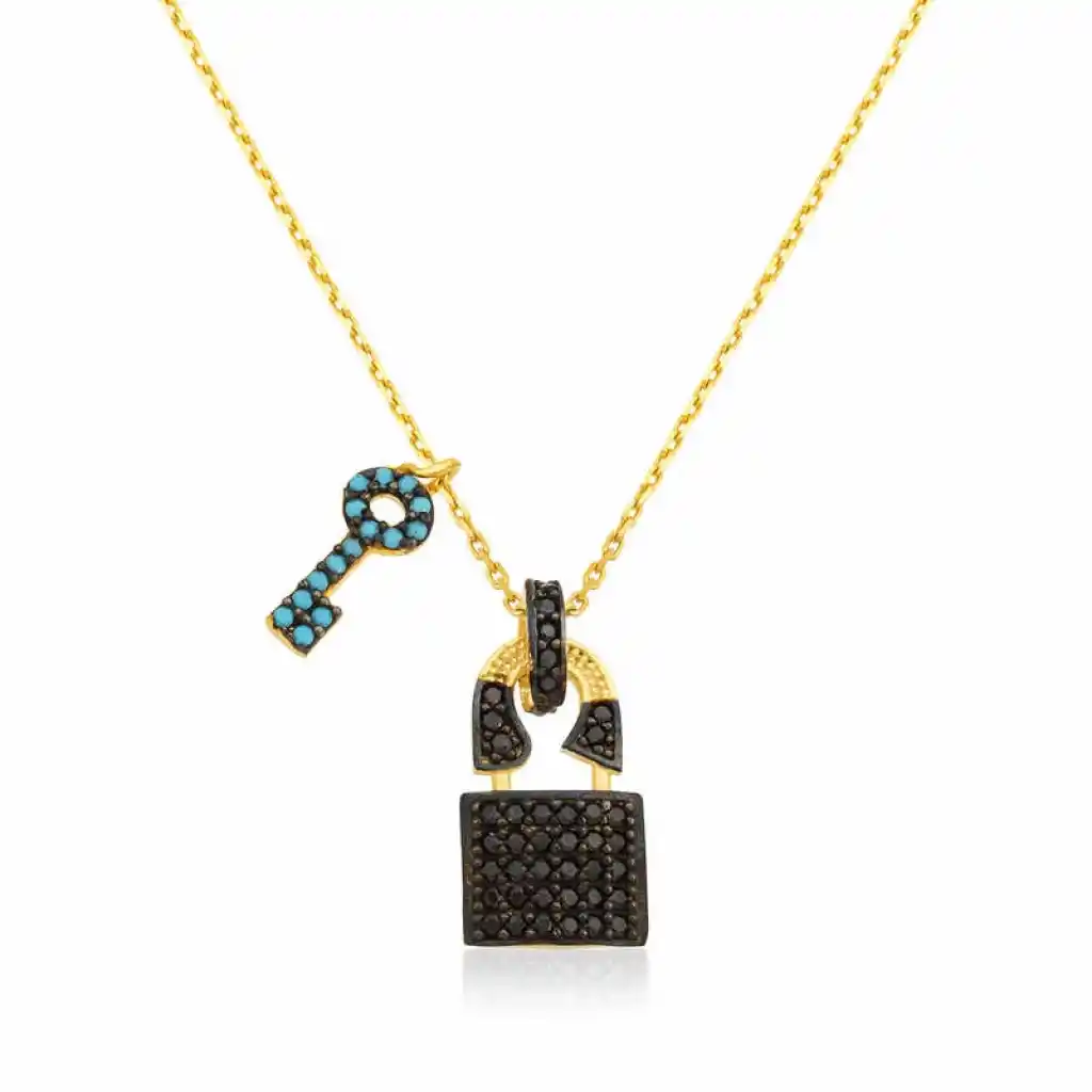 Sade ve şık tasarımıyla sevdiklerinizin günlük hayatta rahatlıkla kullanabilecekleri bir model olan gümüş kalbimin anahtarı bayan kolye 925 ayar gümüşten imal edilmiştir. Gümüş üzerine altın kaplama yapılmıştır. Altın kaplama yapılan gümüş bayan kolye modelleri parlaklığını uzun süre muhafaza eder ve oksitlenmesi gecikir. Bu kolye üzerinde bulunan taşlar zirkondur. Gümüş olan zincirin boyu ortalama 45 cm"dir. Tüm bayan kolye modellerinde olduğu gibi gümüş kalbimin anahtarı bayan kolye modeli de el emeği ile üretilmiştir. Gümüş ve değerli taşlar nedeniyle belirtilen ürün ağırlığında ± %10 sapma olabilmektedir.