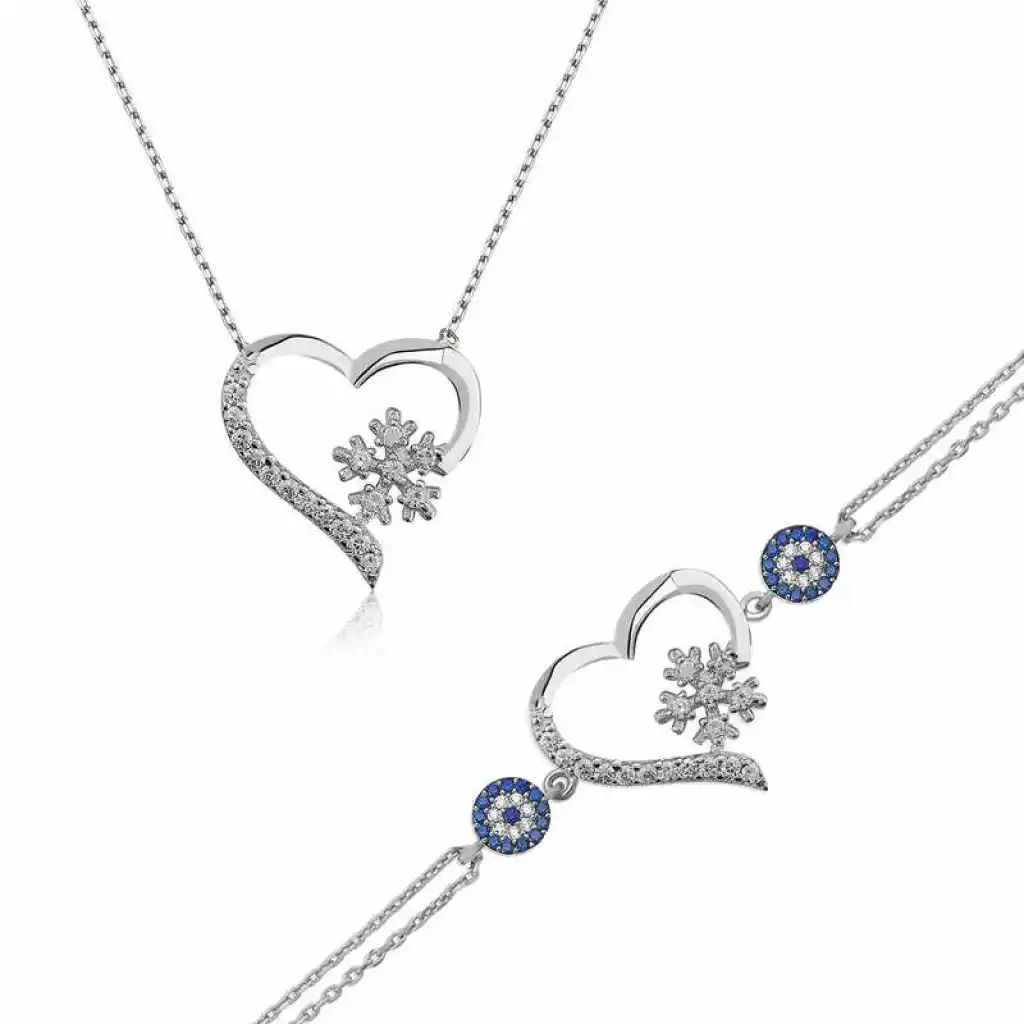 Gümüş ışıl ışıl zirkon taşlarla süslenmiş kalp içinde kar tanesi kolye ve bileklik modeli sevdiklerinizin benzersiz olduğunu anlatmaya yetecek bir hediye olacaktır. 925 ayar gümüşten imal edilmiştir. Gümüş üzerine rodyum kaplama yapılmıştır. Rodyum kaplama yapılan gümüş bayan kolye ve bileklik modelleri parlaklığını uzun süre muhafaza eder ve oksitlenmesi gecikir. Üzerinde bulunan taşlar zirkondur. Gümüş olan zincir boyu ortalama 45 cm"dir. Tüm gümüş bayan set modellerinde olduğu gibi gümüş kar tanesi kalp bayan kolye ve bileklik modeli de tamamen el emeği ile üretilmiştir. Gümüş ve değerli taşlar nedeniyle belirtilen ortalama ürün ağırlığında ± %10 sapma olabilmektedir.