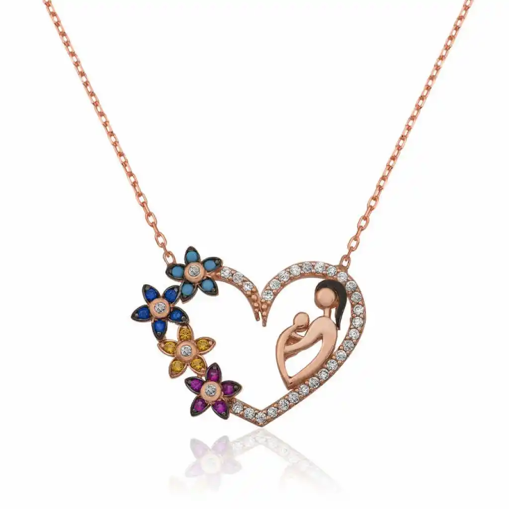 Anne ve çocuğu arasında kan bağı ve en önemlisi o büyük aşkı sizler için tasarladık... Bu duygusal kolye; doğum günü hediyesi, sevgililer günü hediyesi veya anneler gününde hediye olarak özel günlerde tercih edilebilecek mükemmel bir seçenektir. Bu şık tasarım 925 ayar gümüşten imal edilmiştir. Bu kolye üzerinde rose kaplama yapılmıştır. Rose kaplama yapılan kolyeler parlaklığını uzun süre muhafaza eder, gümüş rengini pembe renge çevirir ve oksitlenmeyi geciktirir. Üzerinde bulunan taşlar zirkondur. Tüm gümüş bayan kolyelerde olduğu gibi gümüş kalpli anne ve çocuk kolye de el emeği ile üretilmiştir. Gümüş ve değerli taşlar nedeniyle belirtilen ortalama ürün ağırlığında ± %10 sapma olabilmektedir.