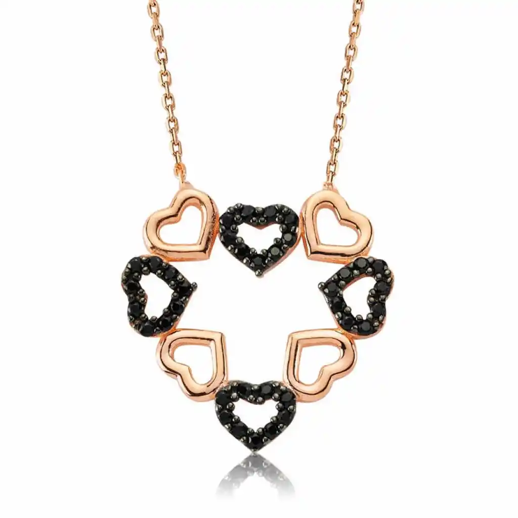 Gümüş Kalpli Aşk Bayan KolyeKalp deseniyle aşkı ifade eden bu kolye ile sevginiz, sevdiğiniz kadının teninde hayat bulsun. Genç sevgililerin ve kendini genç hissedenlerin özel günlerde seçebileceği bu kalpli bayan kolye ile sevdiğinizin boynunu aşkla süsleyin. Sizin olduğu kadar sevdiklerinizin de keyifle takacağı kalpli kolye sevdiğinize en güzel hediyelerden biri olacaktır. Kalpli aşk bayan kolye 925 ayar gümüşten imal edilmiştir. Gümüş üzerine rose kaplama yapılmıştır. Rose kaplama yapılan gümüş bayan kalpli aşk kolyeler parlaklığını uzun süre muhafaza eder ve oksitlenmesi gecikir. Kolye üzerinde bulunan siyah taşlar zirkondur. Gümüş olan zincir boyu ortalama 45 cm"dir. Tüm bayan kolyelerde olduğu gibi gümüş kalpli aşk bayan kolye de el emeği ile üretilmiştir. Gümüş ve değerli taşlar nedeniyle belirtilen ortalama ürün ağırlığında ± %10 sapma olabilmektedir.