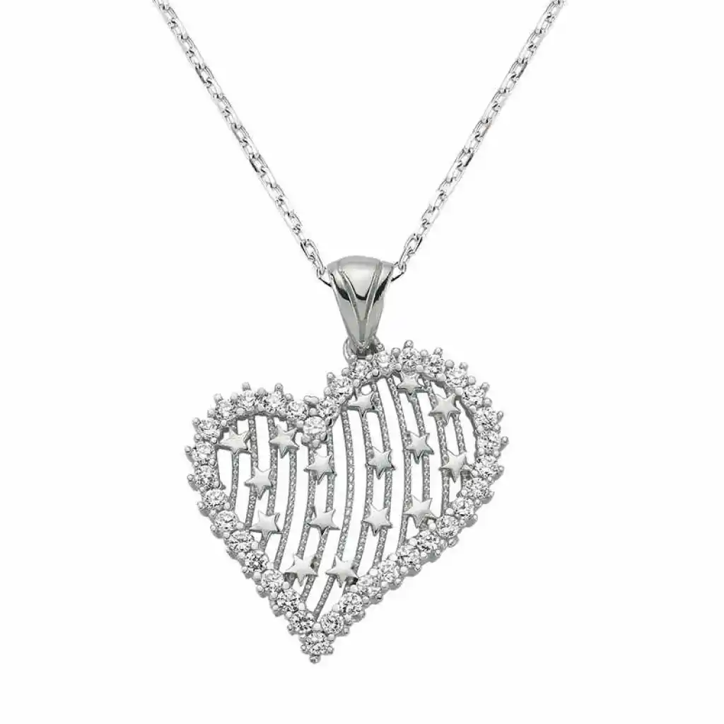 Kalp deseniyle aşkı ifade eden gümüş kalpli bayan kolye modeli ile sevginiz, sevdiğiniz kadının teninde hayat bulsun. Genç sevgililerin ve kendini genç hissedenlerin özel günlerde seçebileceği bu kalpli bayan kolye modeli ile sevdiğinizin boynunu aşkla süsleyin. Sizin olduğu kadar sevdiklerinizin de keyifle takacağı kalp desenli kolye modeli sevdiğinize en güzel hediyelerden biri olacaktır. Kalpli bayan kolye modeli 925 ayar gümüşten imal edilmiştir. Gümüş üzerine rodyum kaplama yapılmıştır. Rodyum kaplama yapılan gümüş bayan kalpli kolye modelleri parlaklığını uzun süre muhafaza eder ve oksitlenmesi gecikir. Kolye üzerinde bulunan beyaz taşlar zirkondur. Gümüş olan zincir boyu ortalama 45 cm"dir. Tüm bayan kolye modellerinde olduğu gibi gümüş kalpli bayan kolye modeli de el emeği ile üretilmiştir. Gümüş ve değerli taşlar nedeniyle belirtilen ortalama ürün ağırlığında ± %10 sapma olabilmektedir.