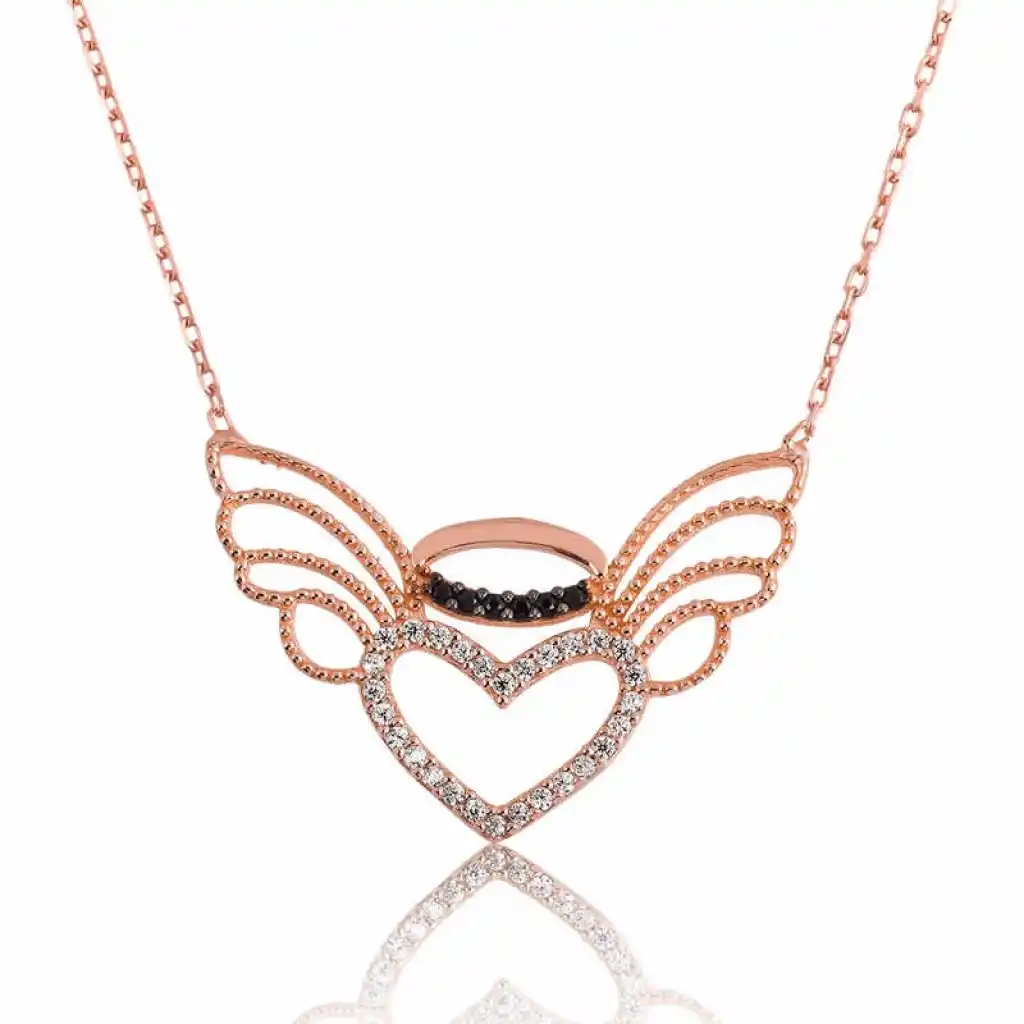 Melekler saflığın ve temizliğin simgeleridir. Bu nedenle melek kolye hediye edilen kişiye melek kadar saf ve temiz olduğu mesajı verilmektedir... Aşkınızı meleklerin koruması için tasarlanan bu özel kalpli melek kanadı bayan kolye; sevgilinize doğum günü , sevgililer günü yada özel günlerde hediye ederek onları mutlu edebilirsiniz... Kolye; 925 ayar gümüşten imal edilmiştir... Tasarım kalpli melek kanadı bayan kolye üzerinde bulunan taşlar zirkondur. Bu bayan gümüş kolye üzerine rose kaplama yapılmıştır. Rose kaplama yapılan tüm kolyeler parlaklığını uzun süre muhafaza eder, gümüşe pembe rengi verir. Tüm gümüş kolyelerde olduğu gibi bu gümüş kalpli melek kanadı bayan kolye de el emeği ile üretilmiştir. Gümüş ve değerli taşlar nedeniyle ürün ağırlığında ± %10 sapma olabilmektedir.