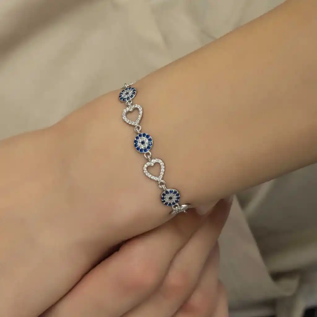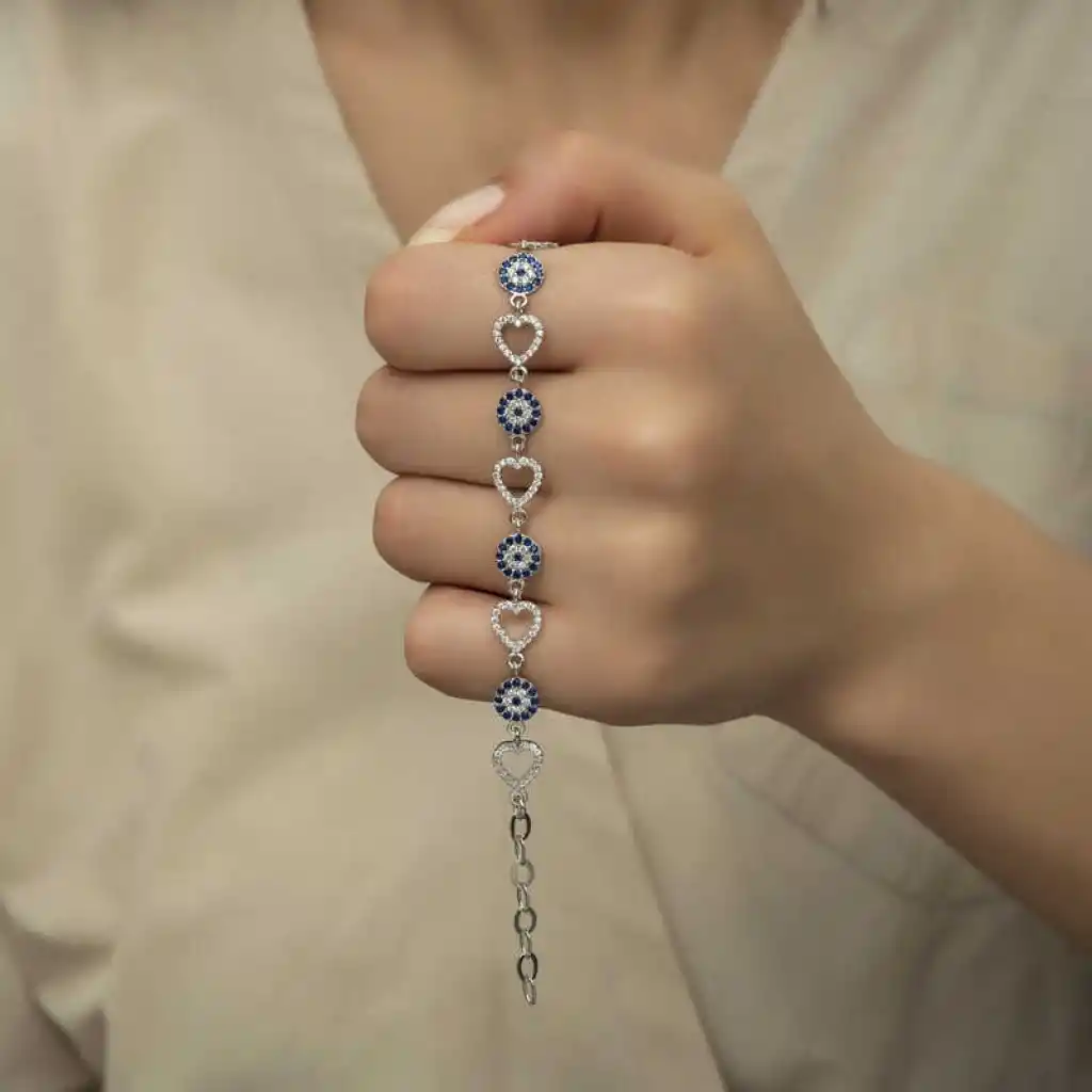 Aşkı bütün saflığı, doğallığı ve içtenliğiyle anlatmanın yoludur kalp... Sonsuz aşkı anlatmak için oluşturulan bu özel tasarımı sevgilinize doğum günü, sevgililer günü yada özel günlerde hediye ederek onları mutlu edebilirsiniz... Bu aşk dolu bileklik 925 ayar gümüşten üretilmiştir. Gümüş kalpli nazar bayan bileklik üzerinde bulunan taşlar zirkondur. Bu bayan gümüş bileklik üzerine rodyum kaplama yapılmıştır. Rodyum kaplama yapılan bileklikler parlaklığını uzun süre muhafaza eder ve oksitlenmesi gecikir. Tüm gümüş bileklik modellerinde olduğu gibi bu gümüş kalpli nazar bayan bileklik modeli de tamamen el emeği ile üretilmiştir. Gümüş ve değerli taşlar nedeniyle belirtilen ortalama ürün ağırlığında ± %10 sapma olabilmektedir.