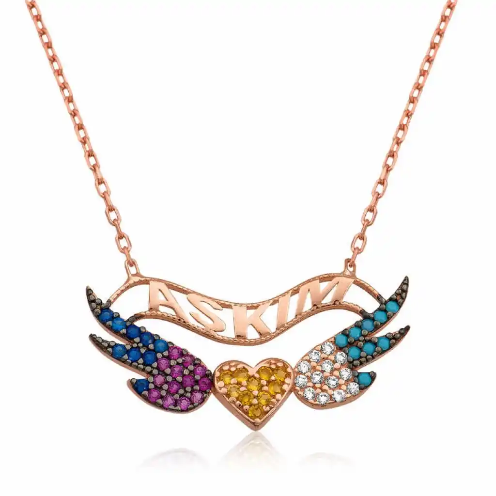 Siz de benim aşkım melek kalpli diyorsanız bu kolye tam size göre... Duygularınızı ifade etmenizde yardımcı olacak bu şık kolye tasarımı en güzel hediye seçeneklerinden biri olacaktır. Kanatlı kalp bayan kolye modeli 925 ayar gümüşten imal edilmiştir. Gümüş üzerine rose altın kaplama yapılmıştır. Rose altın kaplama yapılan gümüş bayan kolye modelleri parlaklığını uzun süre muhafaza eder ve oksitlenmesi gecikir. Kolye üzerinde bulunan taşlar zirkondur. Gümüş kolyenin ortalama boyu 45 cm'dir. Tüm bayan kolye modellerinde olduğu gibi gümüş kanatlı kalp bayan kolye modeli de el emeği ile üretilmiştir. Gümüş ve değerli taşlar nedeniyle belirtilen ürün ağırlığında ± %10 sapma olabilmektedir.
