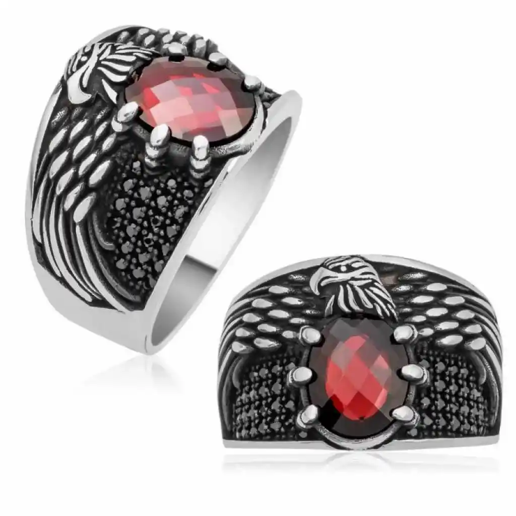 Kuşların kralı olan ve savaşmak üzere dünyaya inen kartal, özellikle savaşçı ve güçlü olmasıyla tanınır; bu yüzden pek çok ulusun sembolü olmuştur. Bu derin anlamdan esinlenerek oluşturulan kartal erkek yüzük; kendinize yada sevdiklerinize doğum gününde, babalar gününde yada özel günlerde hediye edebilirsiniz. Bu şık erkek yüzük 925 ayar gümüşten imal edilmiştir. Gümüş üzerine oksit kaplama yapılmıştır. Oksit kaplama yapılan yüzükler parlaklığını uzun süre muhafaza eder. Üzerinde bulunan kırmızı ve siyah renkli taşlar zirkondur. Tüm erkek yüzüklerde olduğu gibi gümüş kanatlı kartal erkek yüzük de el emeği ile üretilmiştir. Gümüş ve değerli taşlar nedeniyle ürün ağırlığında ± %10 sapma olabilmektedir.