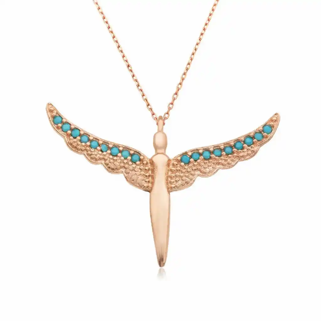 Melekler saflığın ve temizliğin simgeleridir. Bu nedenle melek kolye hediye edilen kişiye melek kadar saf ve temiz olduğu mesajı verilmektedir... Aşkınızı meleklerin koruması için tasarlanan bu özel kanatlı melek bayan kolyeyi sevgilinize; doğum günü, sevgililer günü ve özel günlerde hediye ederek onları mutlu edebilirsiniz. Kolye; 925 ayar gümüşten imal edilmiştir. Gümüş melek bayan kolye üzerine rose kaplama yapılmıştır. Rose kaplama yapılan tüm kolyeler parlaklığını uzun süre muhafaza eder, gümüşe pembe rengi verir. Tüm gümüş kolyelerde olduğu gibi bu gümüş kanatlı melek bayan kolye de el emeği ile üretilmiştir. Gümüş ve değerli taşlar nedeniyle ürün ağırlığında ± %10 sapma olabilmektedir.