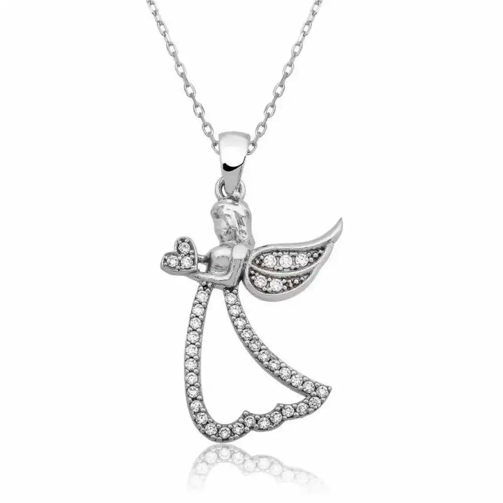 Gümüş Kanatlı melek motifi ile tasarlanmış bu bayan kolye modeli 925 ayar gümüşten imal edilmiştir. Gümüş üzerinde bulunan taşlar zirkondur. Gümüş kanatlı melek bayan kolye üzerinde rodyum kaplama yapılmıştır. Rodyum kaplama yapılan tüm gümüş bayan kolye modelleri parlaklığını uzun süre muhafaza eder. Uzunluğu 45 cm olan gümüş zincir ile gönderilir. Tüm gümüş bayan kolye modellerinde olduğu gibi gümüş melek bayan kolye modelimiz de el emeği ile üretilmiştir. Gümüş ve değerli taşlar nedeniyle belirtilen ürün ağırlığında ± %10 sapma olabilmektedir.a