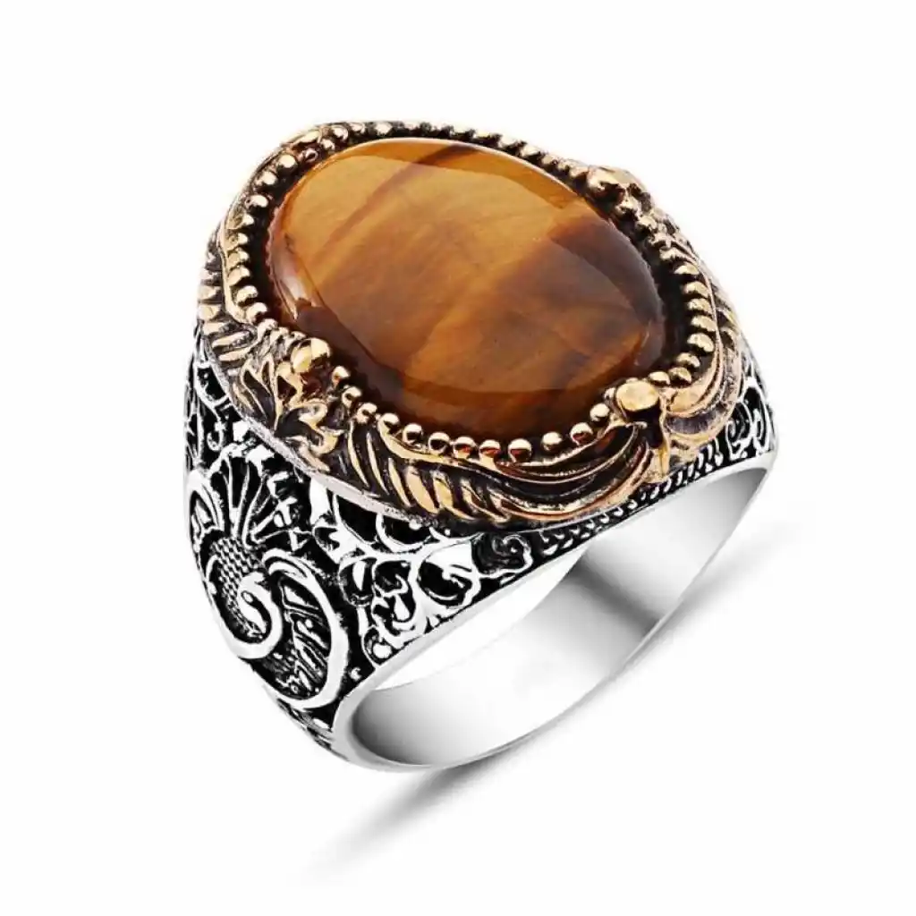 Kaplan gözü, Kristal Kuvars’ın bir alt türü olan Kalsedon grubuna bağlı bir değerli taştır. Adını, kaplanın gözlerine benzeyen kendine özgü renk tonlarından alır. Altınımsı ya da bal rengi olarak tanımlanan çizgisel tonları vardır. Yanardöner ve ipeğimsi görünüşü kaplan gözünü eşsiz kılan özelliklerinden biridir. “Sevgililerin taşı” olarak da tanımlanan kaplan gözü, duygulara hitap eden bir taştır. Değerli taşlar arasında, “koruyucu” özelliği ile en çok öne çıkanlardan biridir. Kullananın hareketlerine veya ruhsal durumuna göre renk değiştirmesi de bilinen özelliklerinden biridir. Bu şık yüzüğü; kendinize yada sevdiklerinize doğum gününde, babalar gününde yada özel günlerde tercih edebilirsiniz. Bu şık yüzük 925 ayar gümüşten imal edilmiştir. Gümüş üzerine oksit kaplama yapılmıştır. Oksit kaplama yapılan yüzükler otantik bir görünüme kavuşur. Tüm erkek yüzüklerde olduğu gibi gümüş kaplan gözü erkek yüzük modeli de el emeği ile üretilmiştir. Gümüş ve değerli taşlar nedeniyle belirtilen ortalama ürün ağırlığında ± %10 sapma olabilmektedir.