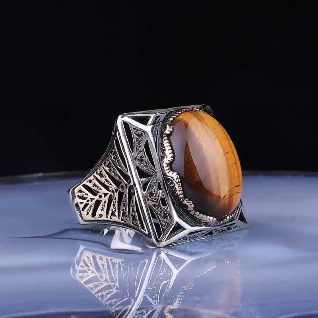 Gümüş üzerindeki kaplan gözü taştan oluşan bu erkek yüzük modeli günün her anında kullanabileceğiniz şık bir aksesuardır. Bu yüzüğü; kendinize ya da sevdiklerinize doğum gününde, babalar gününde ya da özel günlerde hediye edebilirsiniz. Bombeli oval kaplan gözü taşlı erkek yüzük modeli 925 ayar gümüşten imal edilmiştir. Gümüş üzerine oksit kaplama yapılmıştır. Oksit kaplama yapılan gümüş erkek yüzük modelleri parlaklığını uzun süre muhafaza eder. Tüm erkek yüzüklerde olduğu gibi gümüş kaplan gözü taşlı erkek yüzük modeli de el emeği ile üretilmiştir. Gümüş ve değerli taşlar nedeniyle belirtilen ortalama ürün ağırlığında ± %10 sapma olabilmektedir.