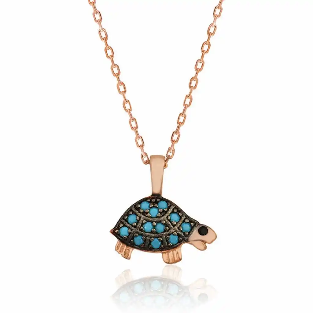 Kaplumbağalar kainatta yaş itibariyle en eski canlılardır. Bu sebepten dolayı bilgeliği sembolize eder. Bunun yanında çok ağır hareket edip sonunda amaçlarına varmaları da; sabrı sembolize eder. Bu şık kolyeyi; doğum günü hediyesi, sevgililer günü hediyesi veya annelere hediye olarak özel günlerde tercih edebilirsiniz. Kaplumbağa kolye modeli 925 ayar gümüşten imal edilmiştir. Gümüş üzerine rose altın kaplama yapılmıştır. Rose altın kaplama yapılan gümüş kolyeler parlaklığını uzun süre muhafaza eder, gümüş rengini pembe renge dönüştürür, oksitlenmesi gecikir. Gümüş kaplumbağa bayan kolyenin üzerinde bulunan taşlar zirkondur. Tüm gümüş kolyelerde olduğu gibi gümüş kaplumbağa bayan kolyenin de tamamı el emeği ile üretilmiştir. . Gümüş ve değerli taşlar nedeniyle belirtilen ortalama ürün ağırlığında ± %10 sapma olabilmektedir.