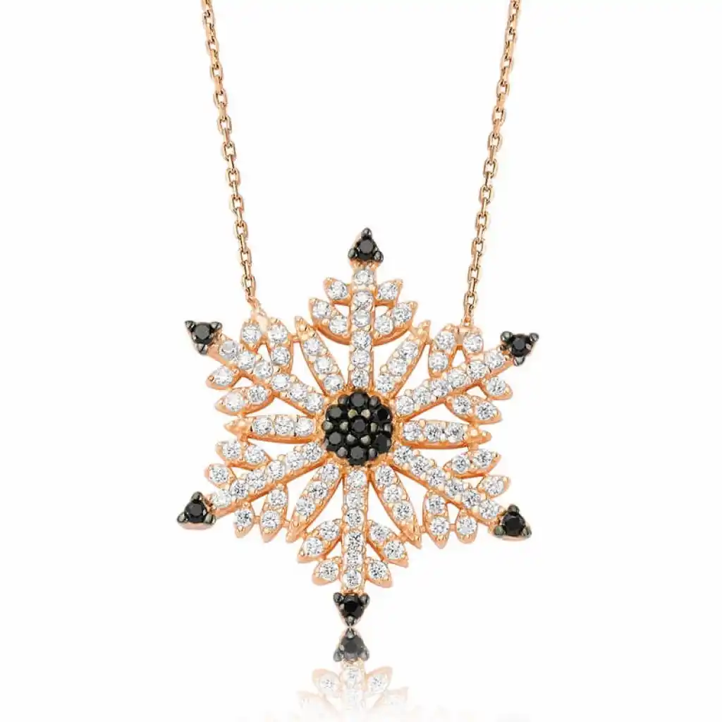 Kadınların ışıltısı, berraklığı kar tanesine benzetilip özel olarak tasarlanmıştır. Kar tanelerinin her birinin bayanlar gibi eşsiz ve ayrı kıymette olması onları özel kılan bir diğer özelliktir. Asilliği her dönemde dikkat çekmeyi başarmıştır. Bunun yanında insanların tıpkı kar taneleri gibi birbirlerine zarar vermeden de mutlu bir şekilde yaşayabileceklerini sembolize etmektedir. Bu şık kolye; doğum günü hediyesi, sevgililer günü hediyesi veya annelere hediye olarak özel günlerde tercih edilebilecek mükemmel bir seçenektir. Kolye, 925 ayar gümüşten imal edilmiştir. Gümüş üzerine rose kaplama yapılmıştır. Rose altın kaplama yapılan gümüş bayan kolye modelleri parlaklığını uzun süre muhafaza eder, gümüşü pembe renge dönüştürür ve oksitlenmesi gecikir. Zincir boyu ortalama 45 cm"dir. Tüm gümüş bayan kolye modellerinde olduğu gibi bu gümüş kar tanesi bayan kolye de tamamı el emeği ile üretilmiştir. Gümüş ve değerli taşlar nedeniyle belirtilen ortalama ürün ağırlığında ± %10 sapma olabilmektedir.
