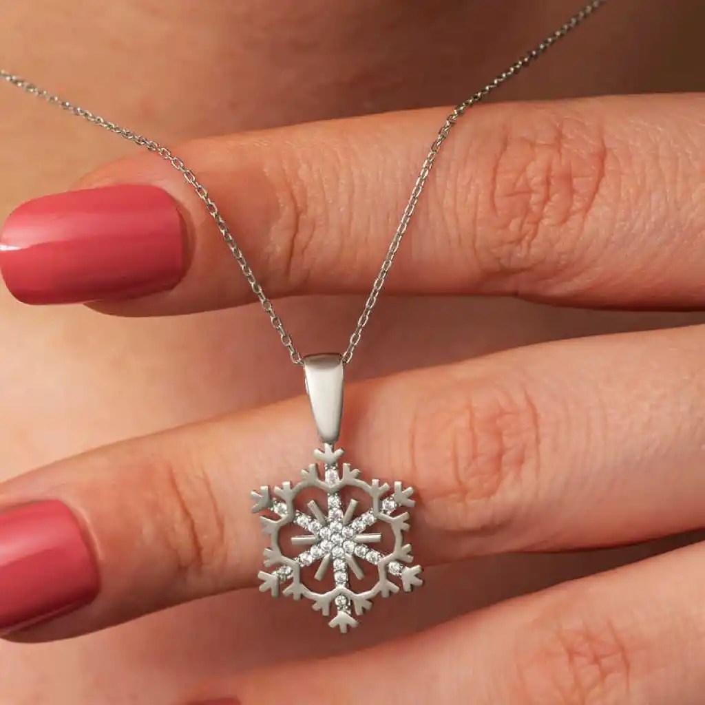 Kadınların ışıltısı, berraklığı kar tanesine benzetilip özel olarak tasarlanmıştır. Kar tanelerinin her birinin kadınlar gibi eşsiz ve ayrı kıymette olması onları özel kılan bir diğer özelliktir. Asilliği her dönemde dikkat çekmeyi başarmıştır. Bunun yanında insanların tıpkı kar taneleri gibi birbirlerine zarar vermeden de mutlu bir şekilde yaşayabileceklerini sembolize etmektedir. Bu şık kolye; doğum günü hediyesi, sevgililer günü hediyesi veya annelere hediye olarak özel günlerde tercih edilebilecek mükemmel bir seçenektir. Kolye, 925 ayar gümüşten imal edilmiştir. Gümüş üzerine rodyum kaplama yapılmıştır. Rodyum kaplama yapılan gümüş kadın kolye modelleri parlaklığını uzun süre muhafaza eder, oksitlenmesi gecikir. Zincir boyu ortalama 45 cm"dir. Tüm gümüş kadın kolye modellerinde olduğu gibi bu gümüş kar tanesi kadın kolye de tamamı el emeği ile üretilmiştir. Gümüş ve değerli taşlar nedeniyle belirtilen ortalama ürün ağırlığında ± %10 sapma olabilmektedir.