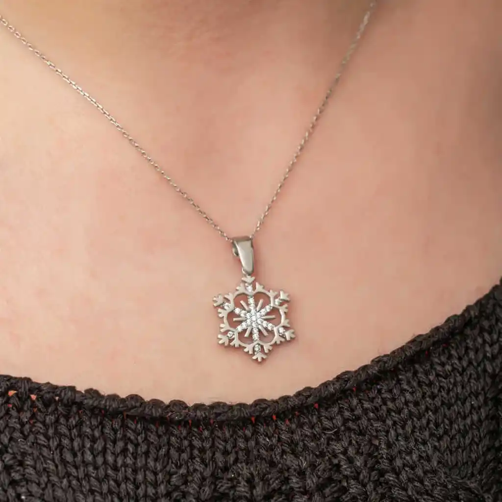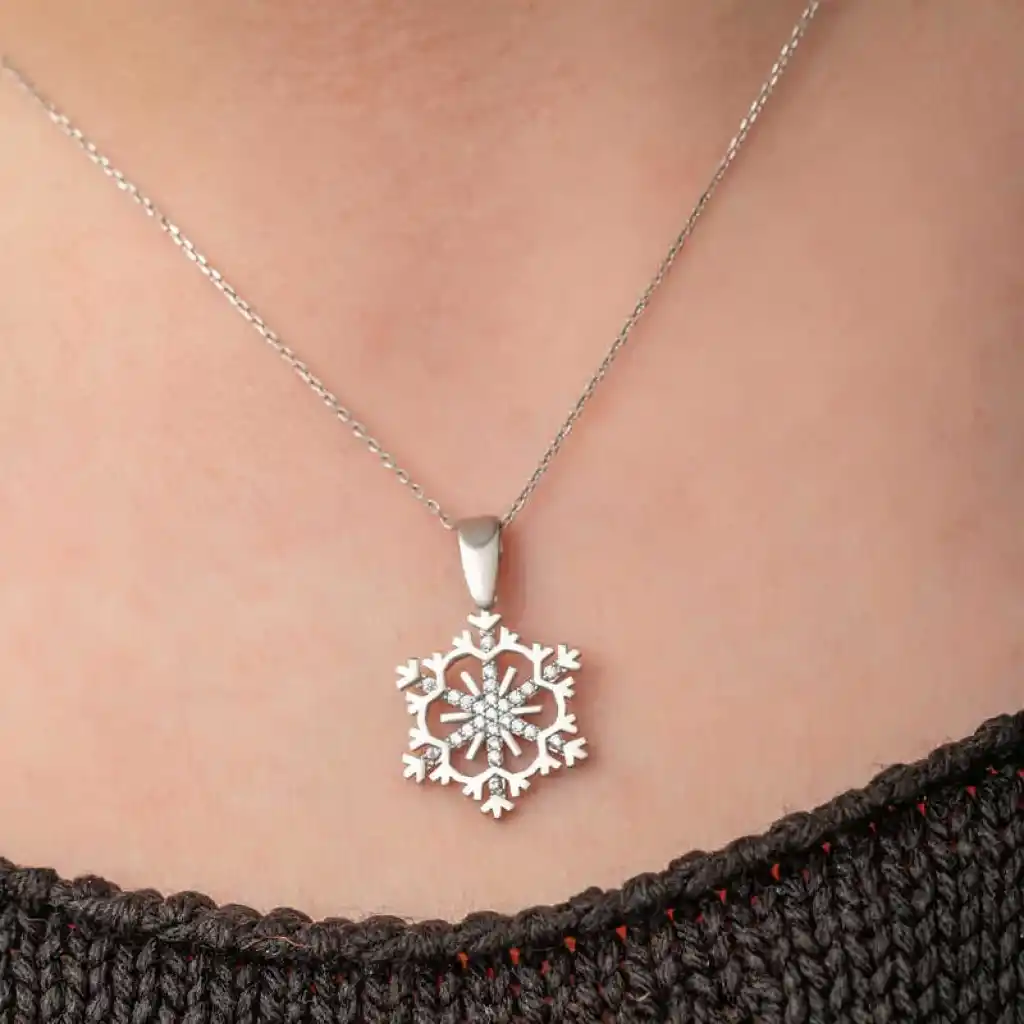 Kadınların ışıltısı, berraklığı kar tanesine benzetilip özel olarak tasarlanmıştır. Kar tanelerinin her birinin kadınlar gibi eşsiz ve ayrı kıymette olması onları özel kılan bir diğer özelliktir. Asilliği her dönemde dikkat çekmeyi başarmıştır. Bunun yanında insanların tıpkı kar taneleri gibi birbirlerine zarar vermeden de mutlu bir şekilde yaşayabileceklerini sembolize etmektedir. Bu şık kolye; doğum günü hediyesi, sevgililer günü hediyesi veya annelere hediye olarak özel günlerde tercih edilebilecek mükemmel bir seçenektir. Kolye, 925 ayar gümüşten imal edilmiştir. Gümüş üzerine rodyum kaplama yapılmıştır. Rodyum kaplama yapılan gümüş kadın kolye modelleri parlaklığını uzun süre muhafaza eder, oksitlenmesi gecikir. Zincir boyu ortalama 45 cm"dir. Tüm gümüş kadın kolye modellerinde olduğu gibi bu gümüş kar tanesi kadın kolye de tamamı el emeği ile üretilmiştir. Gümüş ve değerli taşlar nedeniyle belirtilen ortalama ürün ağırlığında ± %10 sapma olabilmektedir.