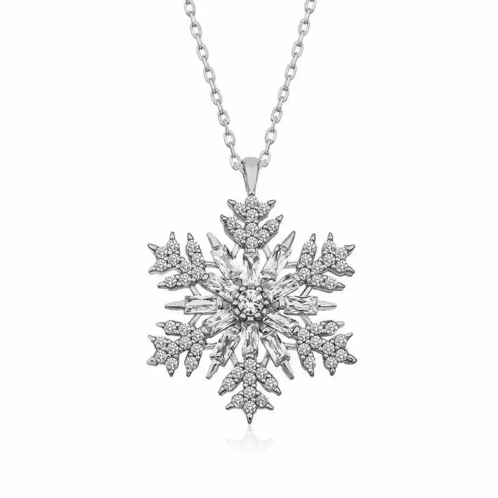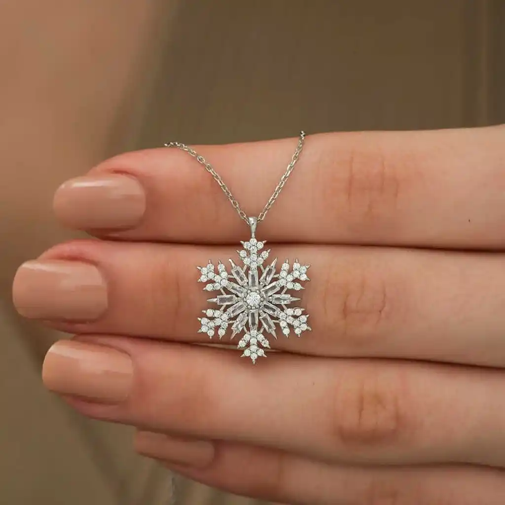 Kadınların ışıltısı, berraklığı kar tanesine benzetilip özel olarak tasarlanmıştır. Kar tanelerinin her birinin bayanlar gibi eşsiz ve ayrı kıymette olması onları özel kılan bir diğer özelliktir. Asilliği her dönemde dikkat çekmeyi başarmıştır. Bunun yanında insanların tıpkı kar taneleri gibi birbirlerine zarar vermeden de mutlu bir şekilde yaşayabileceklerini sembolize etmektedir. Bu şık kolye; doğum günü hediyesi, sevgililer günü hediyesi veya annelere hediye olarak özel günlerde tercih edilebilecek mükemmel bir seçenektir. Kolye, 925 ayar gümüşten imal edilmiştir. Gümüş üzerine rodyum kaplama yapılmıştır. Rodyum kaplama yapılan ürünler parlaklığını uzun süre muhafaza eder ve oksitlenmesi gecikir. Tüm gümüş bayan kolyelerde olduğu gibi bu gümüş kar tanesi bayan kolye de tamamı el emeği ile üretilmiştir. Gümüş ve değerli taşlar nedeniyle belirtilen ortalama ürün ağırlığında ± %10 sapma olabilmektedir.